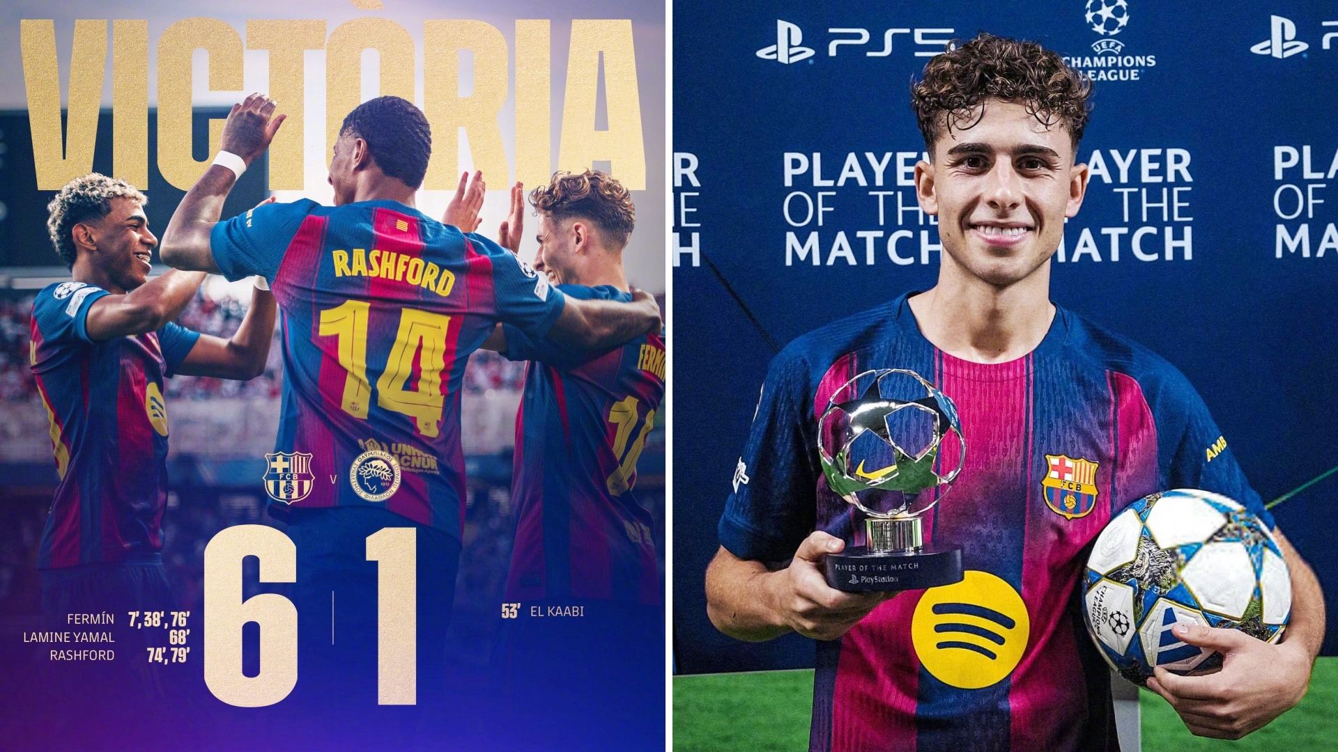 欧冠:巴塞罗那6-1大胜十人奥林匹亚科斯,各项赛事三连胜。 费尔明完成戴帽,拉什福德双响,亚马尔破门。