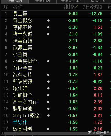 昨晚,黄金大跌,,,今天贵金属板块领跌也就不奇怪了A股