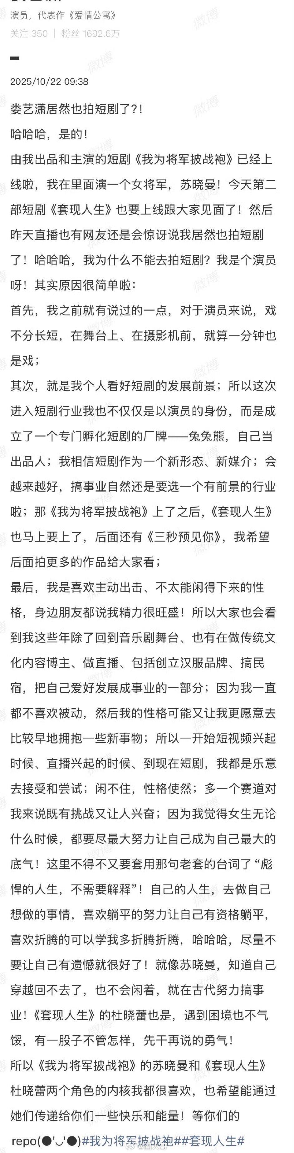 娄艺潇长文回应拍短剧的原因