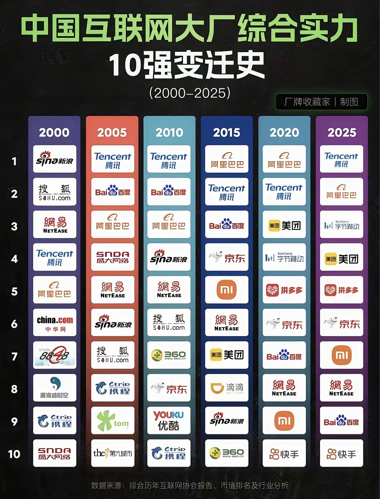 国内互联网大厂综合实力十强变迁史,鹅厂与福报厂是真稳。(图片来自“厂牌收藏家”