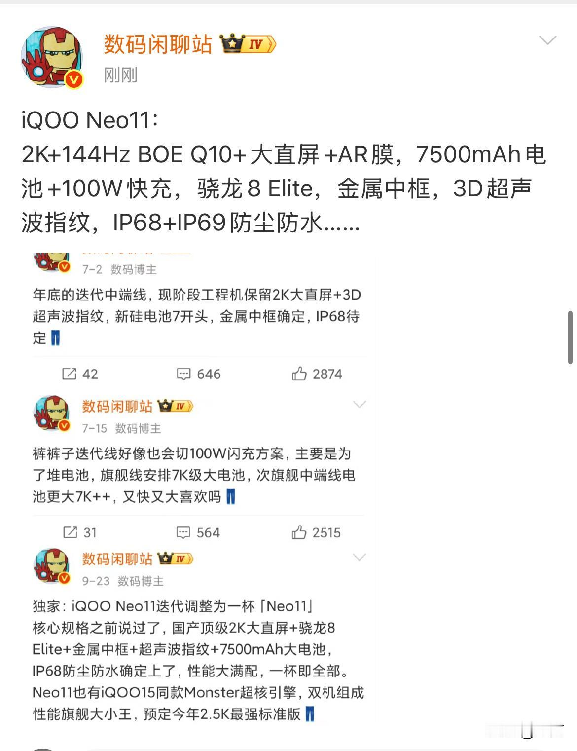 数码闲聊站 : iQOO Neo11详细配置来: 目前能够得知的配置有,2K+144Hz BOE Q10+大直屏+AR膜,再加上7500mAh电池+100W快充,骁龙8 Elite,金属中框,3D超声波指纹,IP68+IP69防尘防水 以这个配置很让人熟悉的感觉就是,很多人心目当中真正的K90的理想配置,不过现在被iQOO Neo11做出来了[捂脸] 当然,这个手机也并非完美,因为他的相机还没有真正的换新,有在乎这一点的朋友们可以直接去上真我GT8[呲牙] 而且如果这个手机没有长久的话,很多人也会考虑真我,每一个手机不可能给你做到面面俱到的原因,就要看你喜欢的特征在哪个方向了。