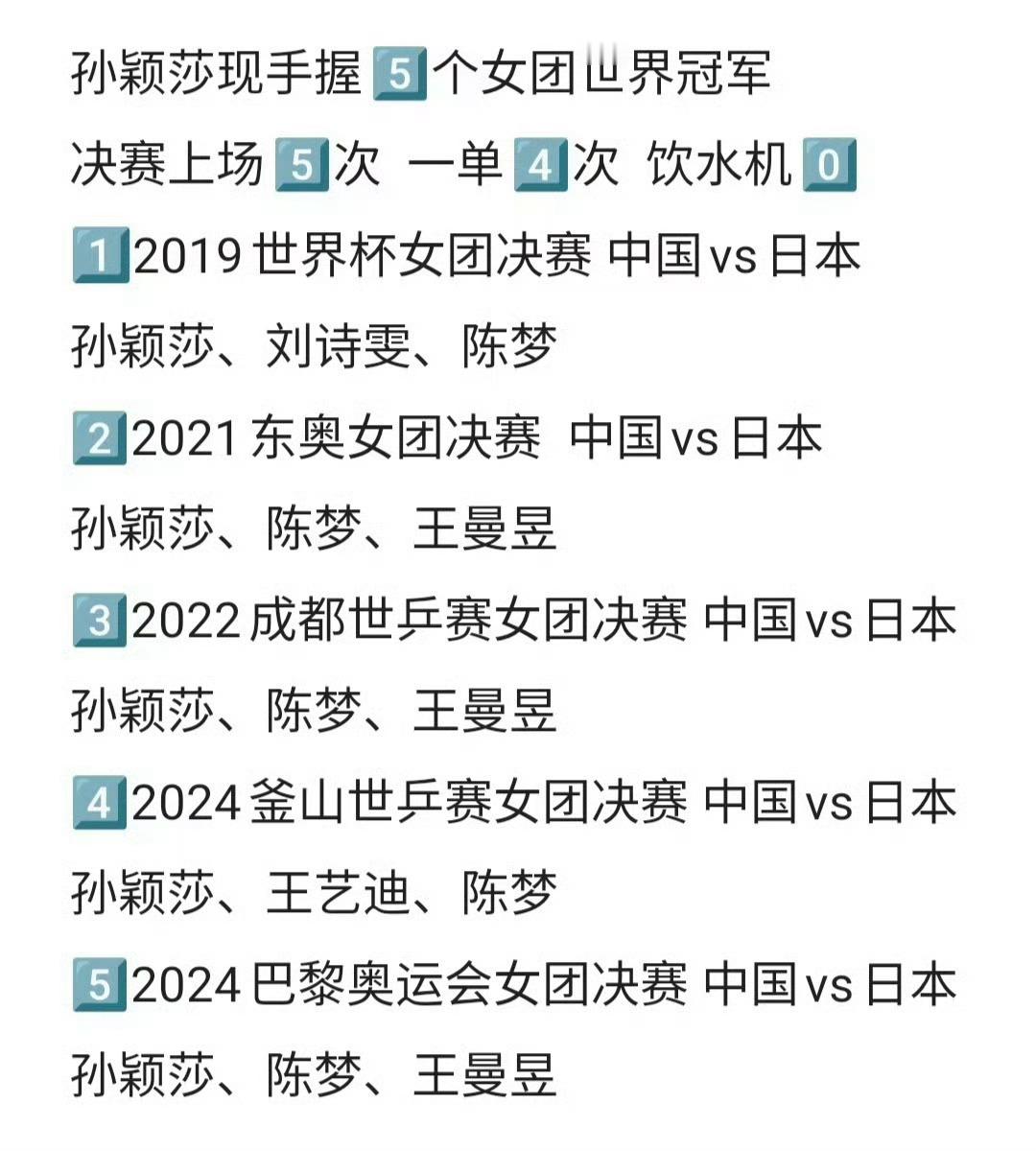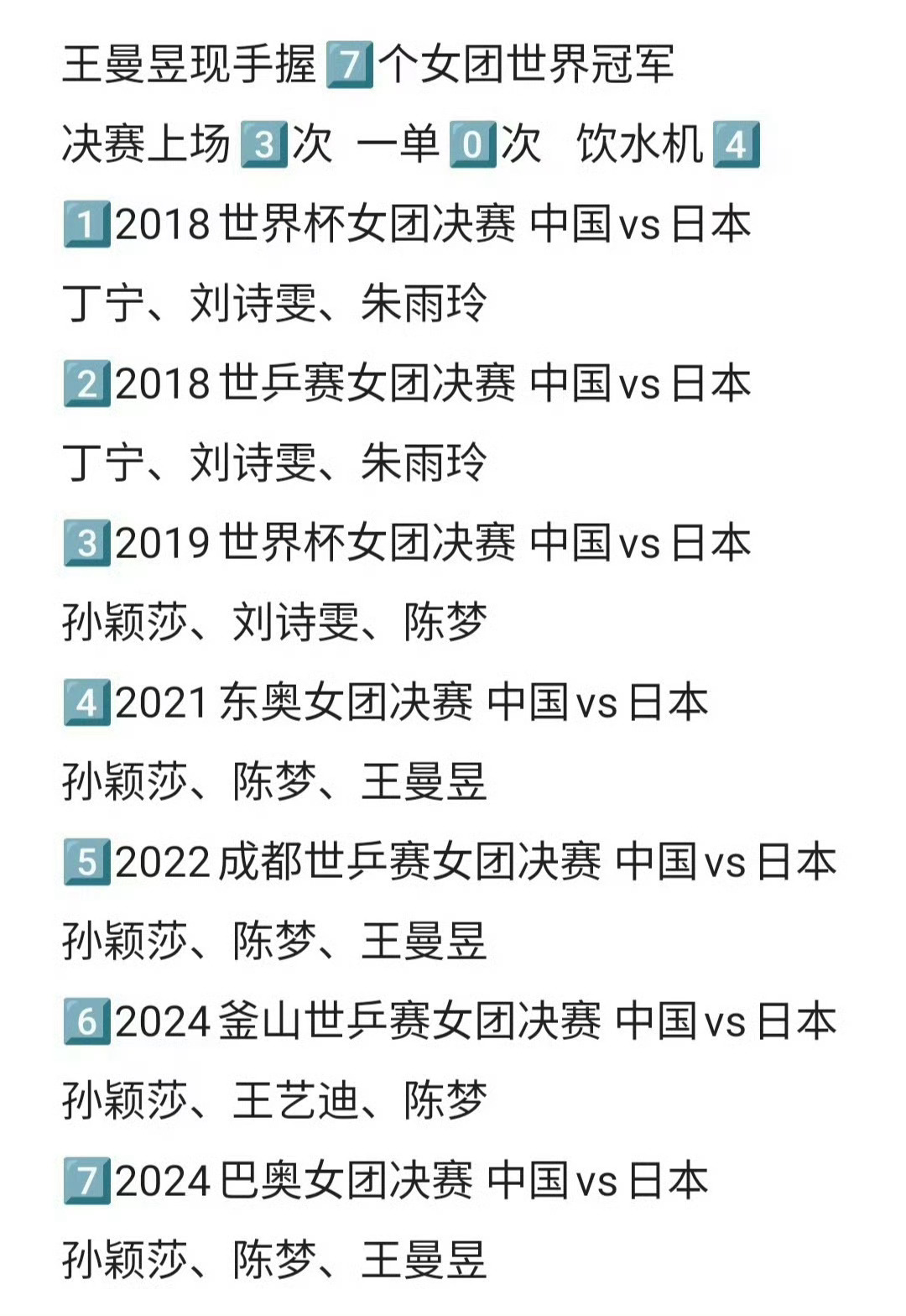 王曼昱现三大赛女团➕亚锦赛女团冠军共1️⃣0️⃣🏆,其中决赛仅4️⃣次上场,0️⃣次一单,1️⃣0️⃣个🏆蹭6️⃣个。