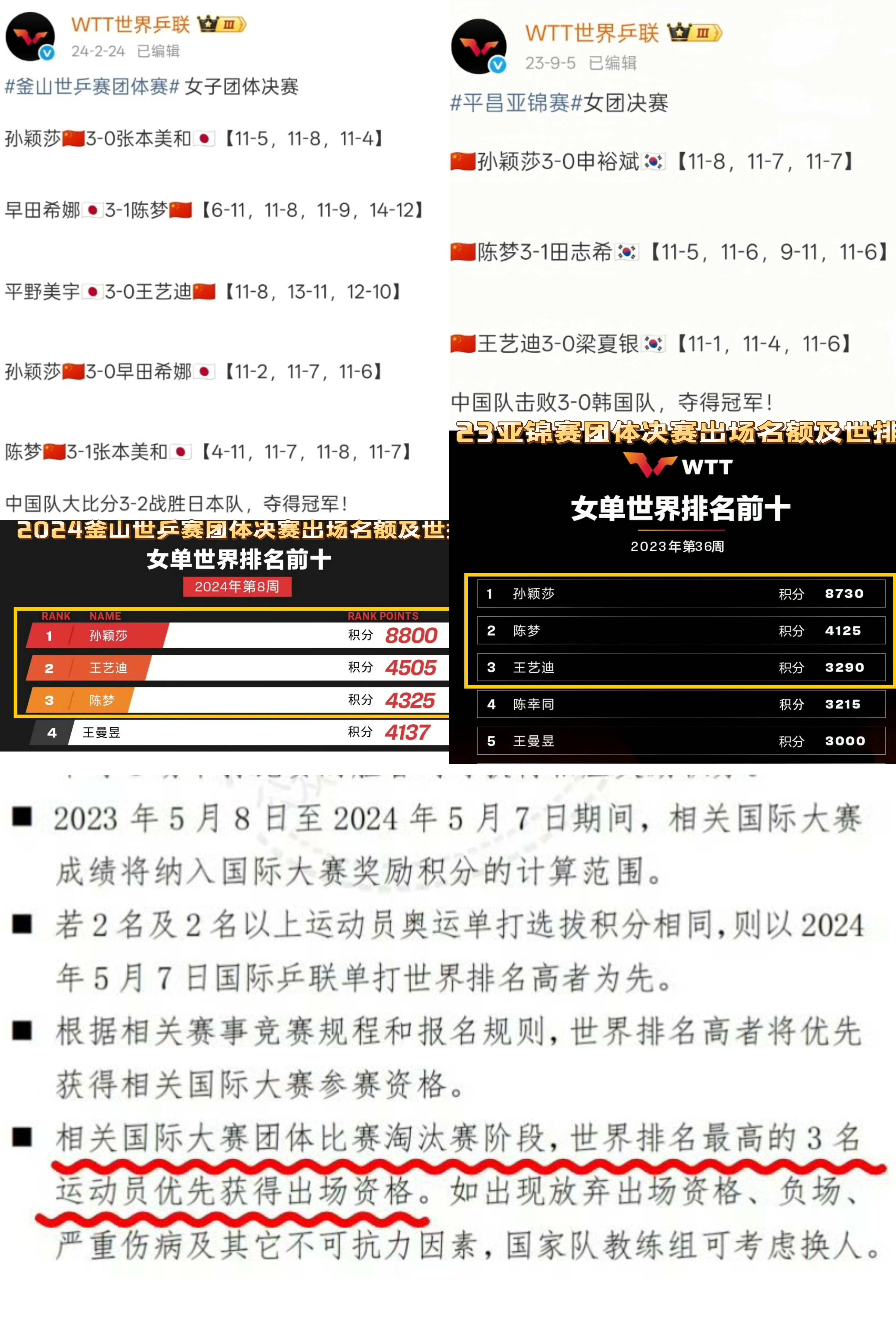 23亚锦24釜山团体淘汰赛时期孙颖莎世排均第1️⃣☝🏻、王曼昱分别是世5️⃣世4️⃣