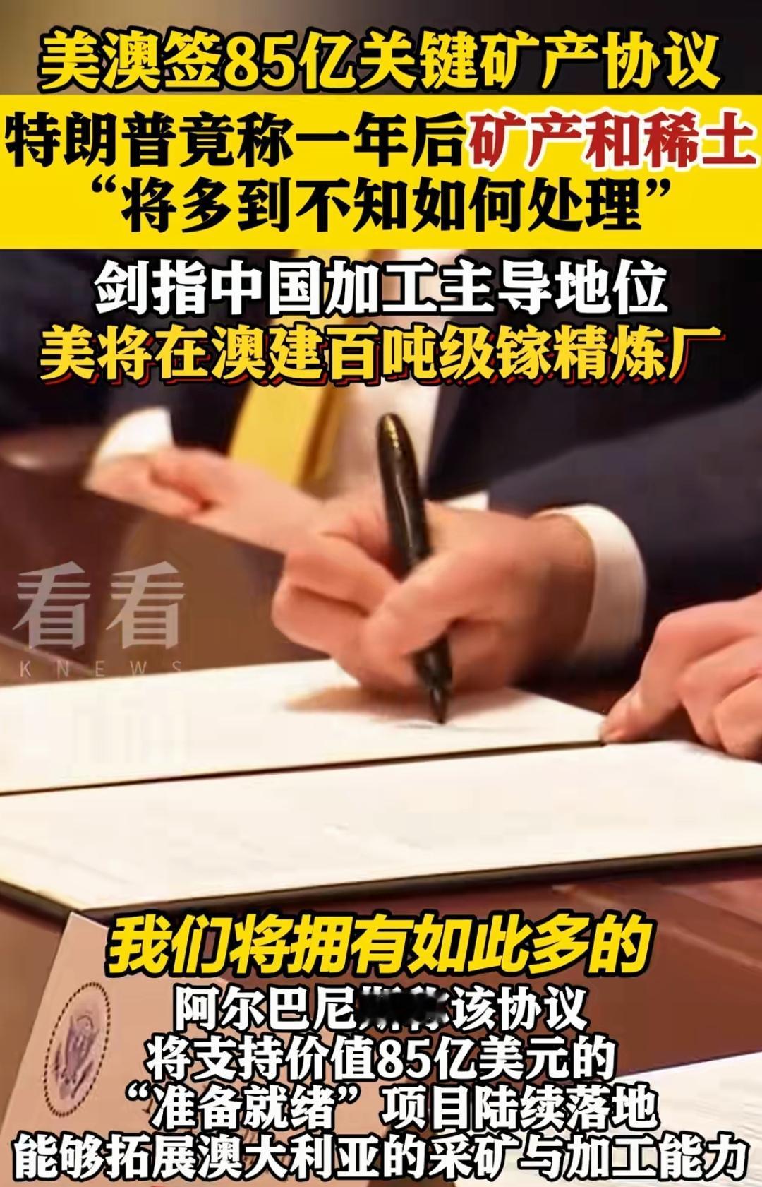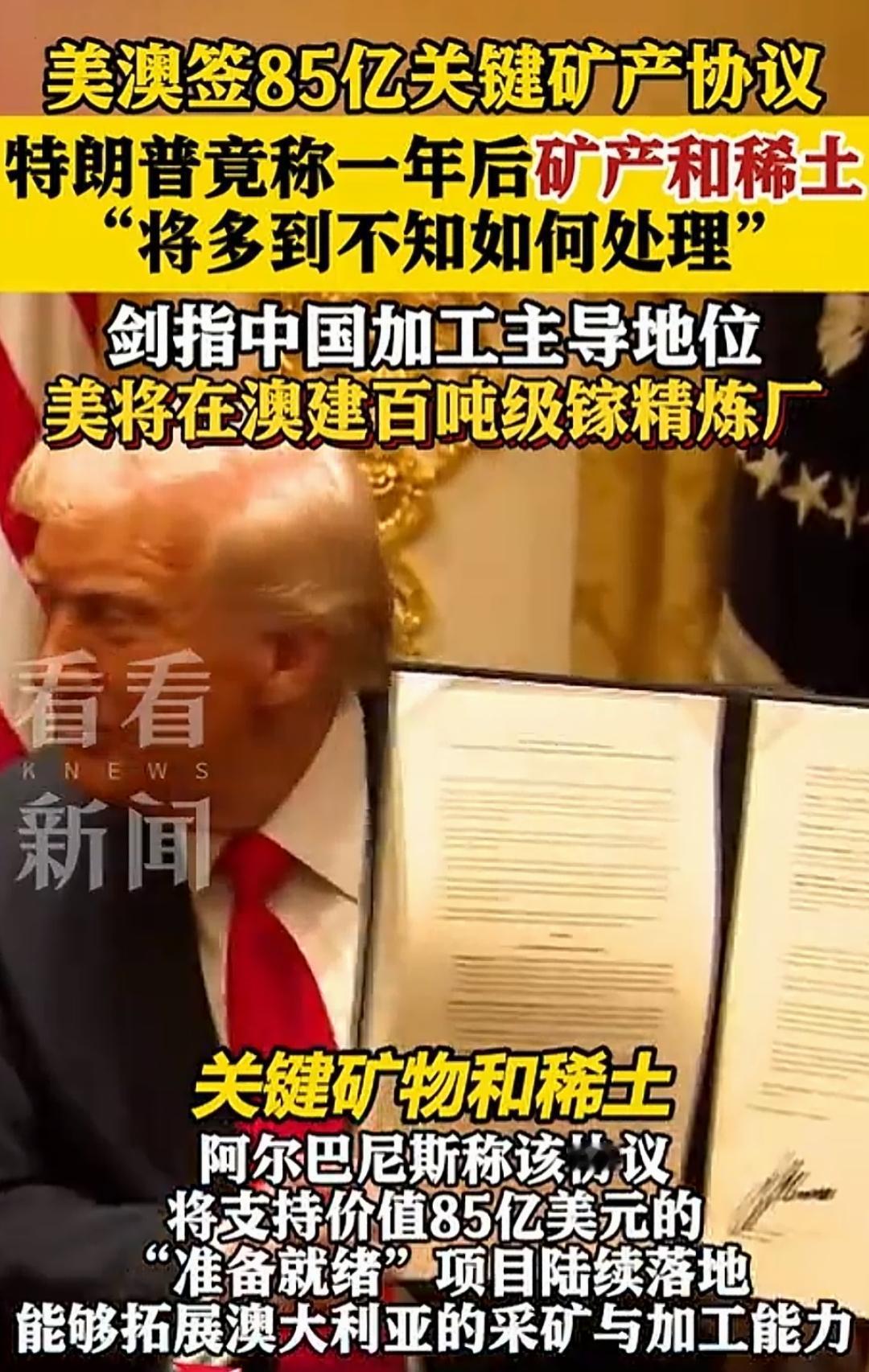 美国明年就能解决稀土问题了。税宗说的,因为他刚刚和土澳签了一个85亿美元的关键矿产大单,高兴昏了。说一年后他们的关键矿产会多到不知道该咋办。 看他那副兴高采烈的样子,仿佛第二天美国就能自产镓、锗、稀土,甩开中国,自己玩转高科技产业,可问题是,你吹牛可以,但现实不答应。 这单所谓的“关键矿产合作”,签的是和澳大利亚,可这话也就是听着响,你别说明年,你就说现在,美国手里有啥? 镓和锗的精炼厂?没有。 稀土分离工艺?靠进口。 矿石?有一部分,但开采成本高得离谱。 而且,他现在,连能提纯的技术都没有,就敢夸下海口“要实现独立供应”,这不是自欺欺人吗? 再说这85亿美元的大单,美国看着是赚到了,但实际上美方掏钱、澳方采矿,然后再运回美国加工,这一进一出,运输成本、能耗成本全得翻倍。 更离谱的是,澳大利亚估计连电都不够供应的,你建个百吨级的镓精炼厂,天天耗电量,跟钢铁厂一样,你拿什么支撑?靠袋鼠跑轮子吗? 所以,这事本质,不是技术突破,是政治表演,其实,这场所谓的“稀土独立梦”,从一开始,就注定只能是场政治戏。 美国不是没资源,是没体系,不是没钱,是没人,不是没想法,是没办法执行。 中国花了三十年,才搭出完整的稀土产业链,从矿石开采、分离提纯到下游磁材、电池,全是系统工程。 (每天更新,点进主页我们一起看世界!喜欢文章的可以帮忙点个关注点个赞~) 美国想靠一个合约,一年时间抄捷径,根本不可能,大家怎么看?