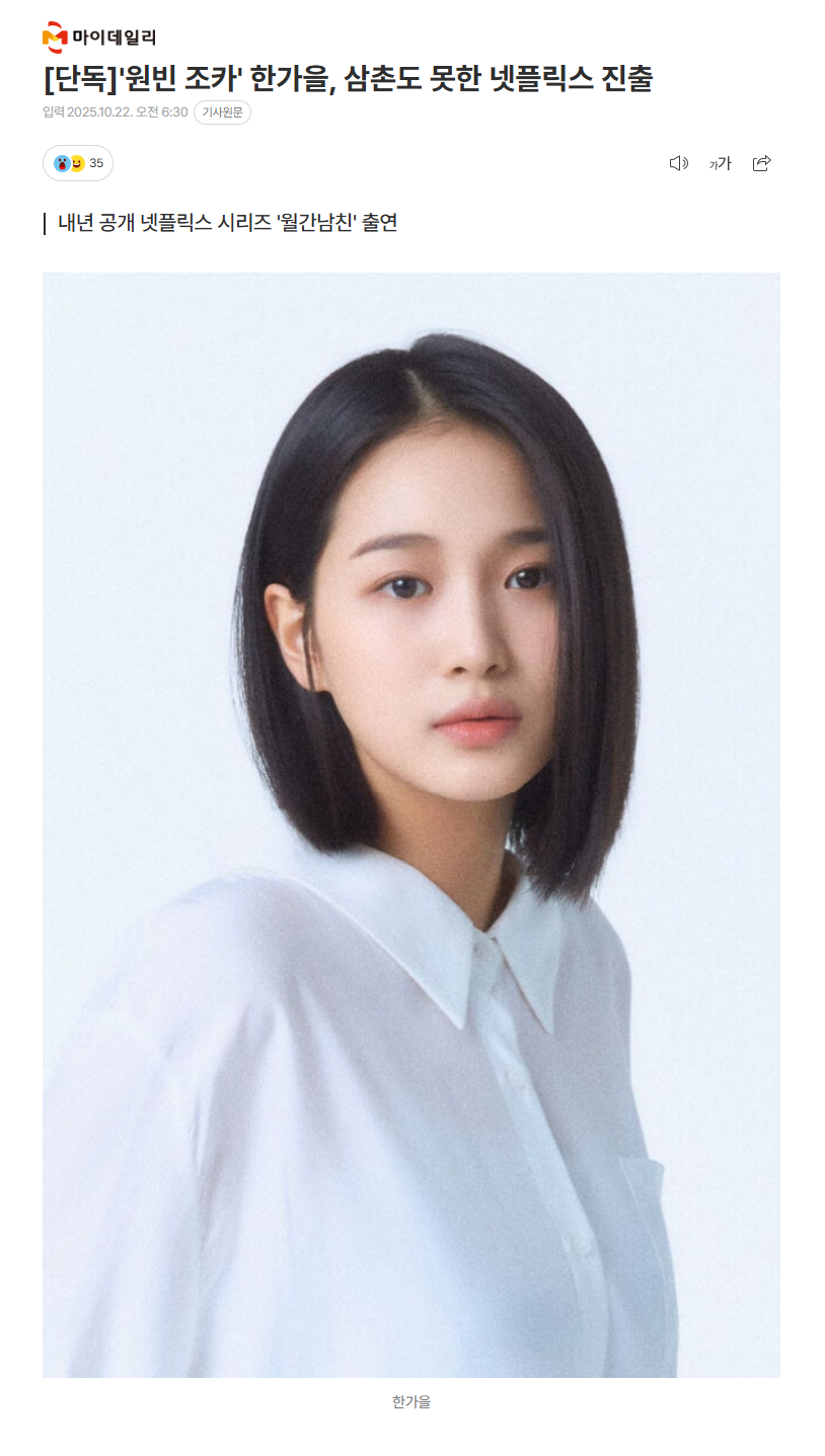 22日据mydaily采访结果显示,韩佳乙将出演于明年春季播出的Netflix系列剧《月刊男友》。