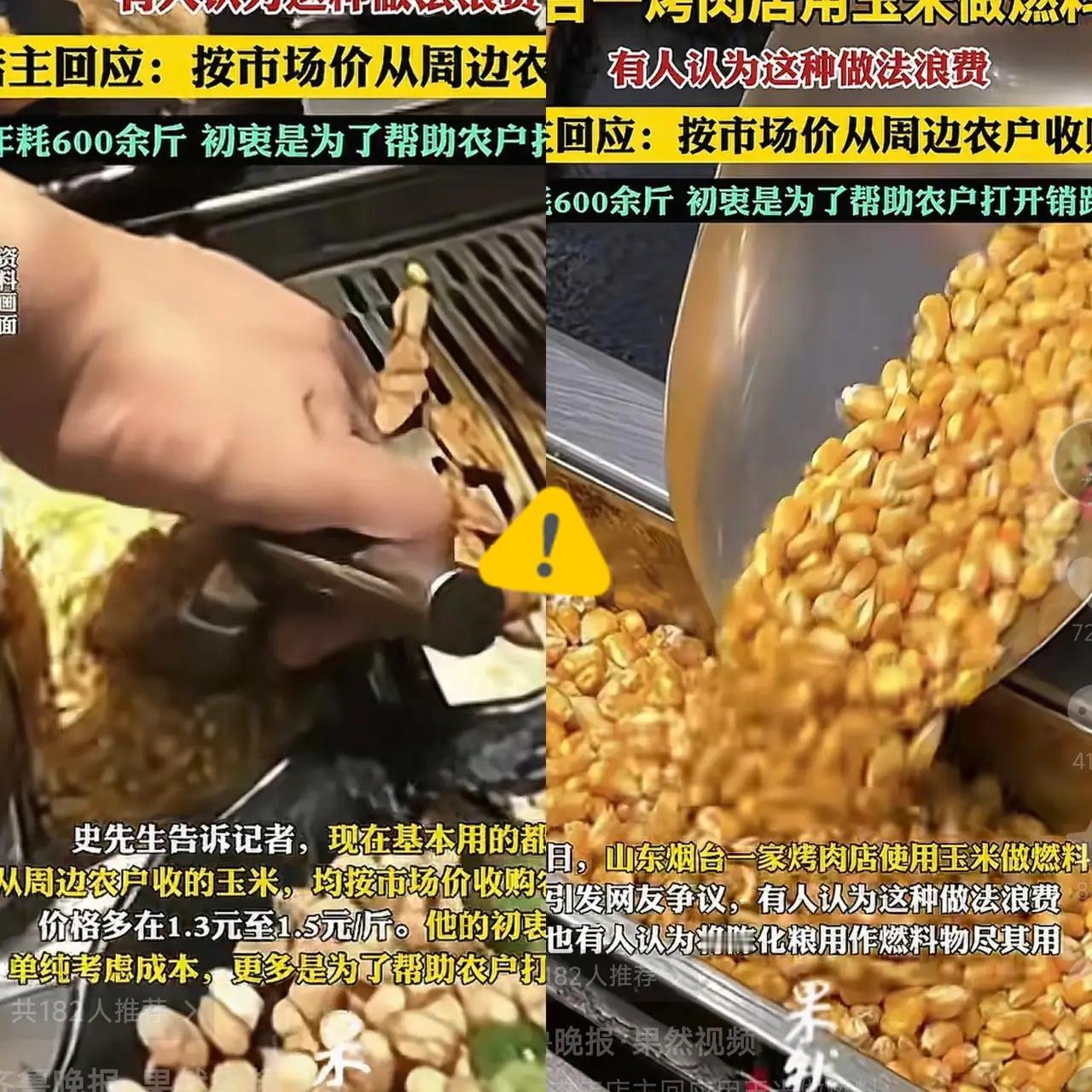 玉米当燃料不是浪费?这事的关键根本不在烤肉店 烟台烤肉店烧玉米引骂战,说浪费粮食的和夸助农的吵翻了,但这事真不能只看表面。店主说按1.3-1.5元/斤收农户卖不掉的玉米,年耗才600多斤,初衷是帮农户变现,这听起来没毛病。 可专家泼了冷水,说玉米烧着热效率低还可能产致癌物,陈化粮本该去做工业原料更值钱。现在监管都劝停了,其实矛盾点从不是烤肉店,而是次等粮没靠谱销路,农户只能贱卖当燃料。 与其骂店家浪费,不如想咋让好粮上餐桌、差粮有好归宿。你觉得该咋帮农户给粮食找对“出路”?