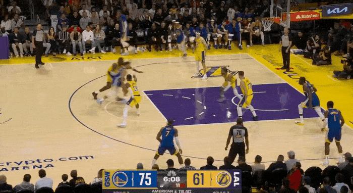 第四记三分!库明加今夏真没少练啊! 在今天NBA揭幕战勇士对阵湖人的第三节比赛中