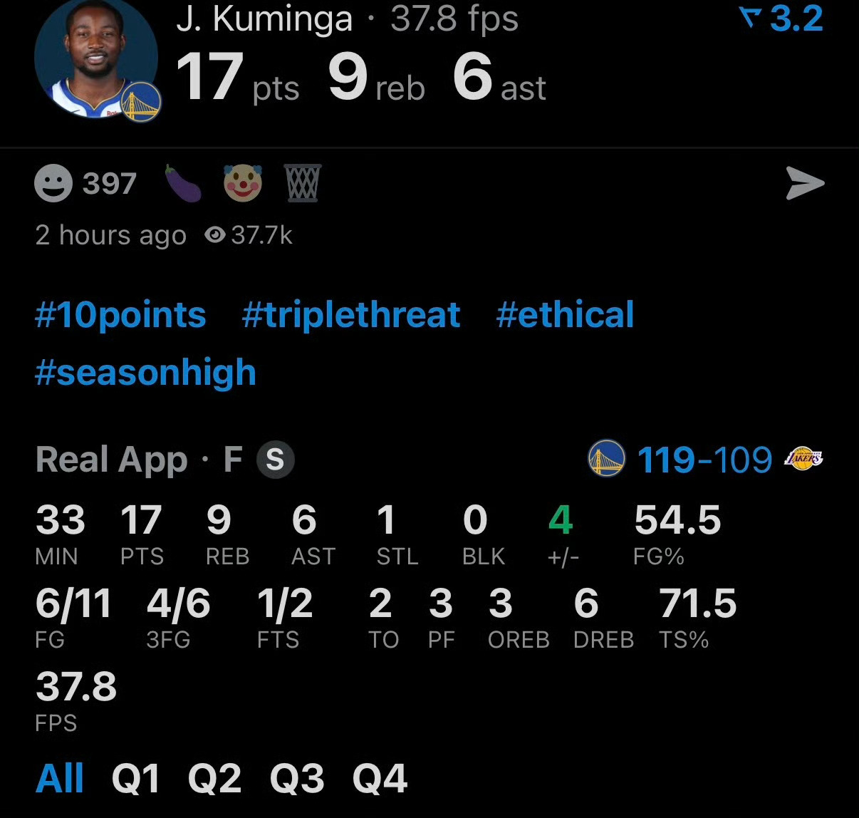 今日比赛对阵湖人,库明加拿到17分9篮板6助攻!