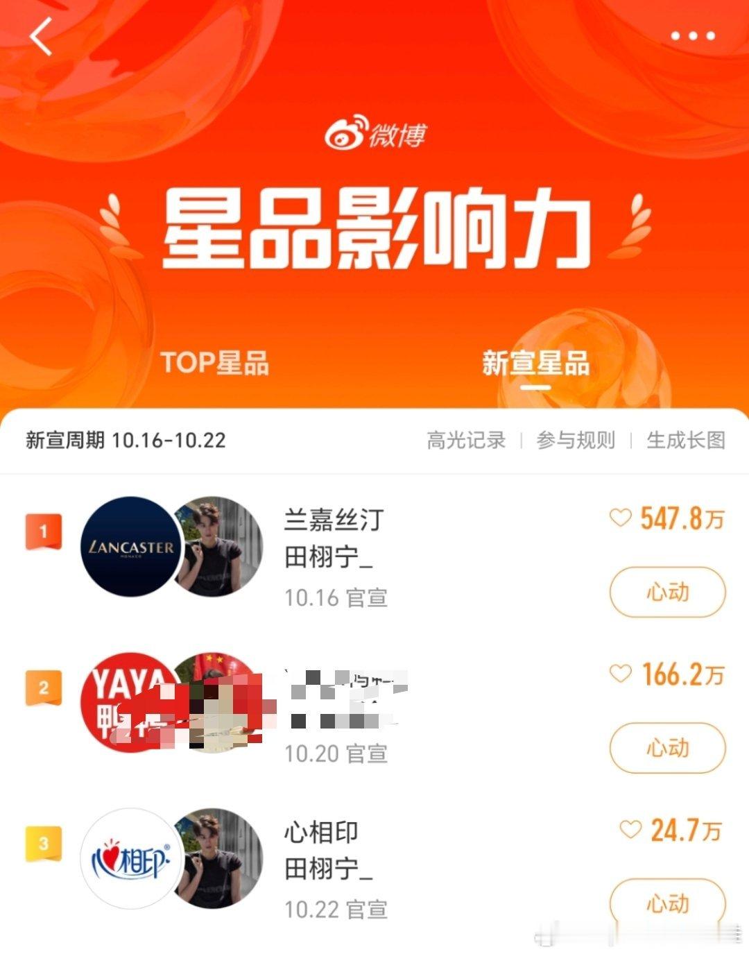 田栩宁两个月7个商务田栩宁 心相印田栩宁今天心相印官宣,星品影响力双榜都登上top1,且41分钟就过亿,直接刷新了新纪录,Top新品前四占2,心相印断层第一,新宣新品前三占2,兰嘉丝汀拿下断层第一!