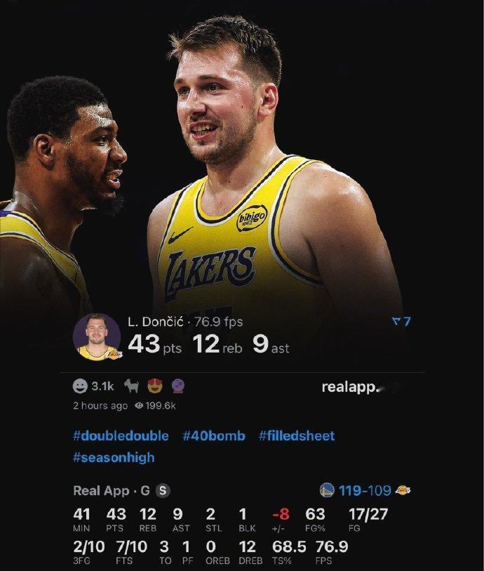 东契奇打成这样也输了! 揭幕战对阵勇士,出战41分钟,27中17,三分10中2,罚球10中7,得到43分12板9助2断1帽。 比赛最艰难的阶段是第三节,整节比赛东契奇几乎是1个打对面5个,其他人死活得不了分,里夫斯也是频频打铁,这个阶段湖人进攻没跟上,成了比赛的转折点。 仅这场比赛而言,说队友CBA有点过分,但也确实没能给东契奇提供什么太大帮助,尤其是被寄予厚望的艾顿,他和东契奇基本上没打成几个挡拆回合,艾顿确实是个高点,但真的只剩下高了....