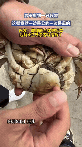 “这下真的解释不清了!”江苏,男子在湖里捞到一只螃蟹,看着平平无奇,拆开后却傻眼了,这螃蟹竟然一半是“小伙子”,一半是“大姑娘”!网友:“这岂不是既又膏又有黄?” 男子把这只螃蟹刚拿到手时,感觉挺普通的。可仔细一瞧,发现有点不对劲。 这螃蟹的身子,左边和右边好像“各有主张”。 它一边的腹部是尖尖的,明显是公蟹才这样。可另一边的腹部却是圆圆的,这可就是母蟹了! 而且它那对大钳子上的绒毛,都是一边浓密一边稀疏,活脱脱一个“阴阳合体”的架势。 这可把男子给看懵了,心里直嘀咕:“我这抓的到底是个啥玩意?” 有网友说,这可是雌雄嵌合体啊,做成标本起码值个四位数,你就这么给拆开看了? 还有网友说,大自然的手笔,真是让人猜不透啊! 其实啊,这种螃蟹可不是什么妖怪,而是一种比较罕见的自然现象。 简单来讲,就是在螃蟹胚胎发育的早期阶段,细胞在分裂的时候出了点“小意外”。 可能有两个精子进入了同一个卵细胞,或者染色体在分配的时候发生了丢失,这些异常情况就导致螃蟹一部分身体细胞是雄性基因型,另一部分身体细胞是雌性基因型。 这两部分像拼图一样,沿着身体中线清晰地拼在了一起,才同时呈现出公蟹和母蟹的特征。 其实像蝴蝶、蛾子,还有龙虾,甚至一些鸟都会这样,但确实非常罕见! 男子抓到一只“阴阳螃蟹”