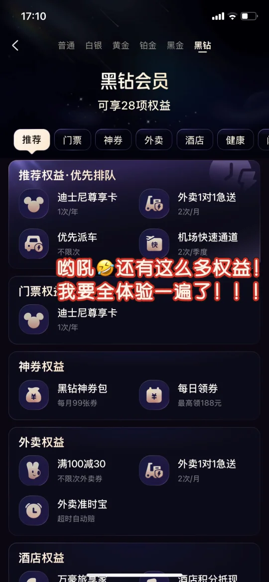 更有无门槛的黑钻神券包、满100-30的外卖神券、免费充电宝、腾讯视频VIP3日卡等28项权益畅用!