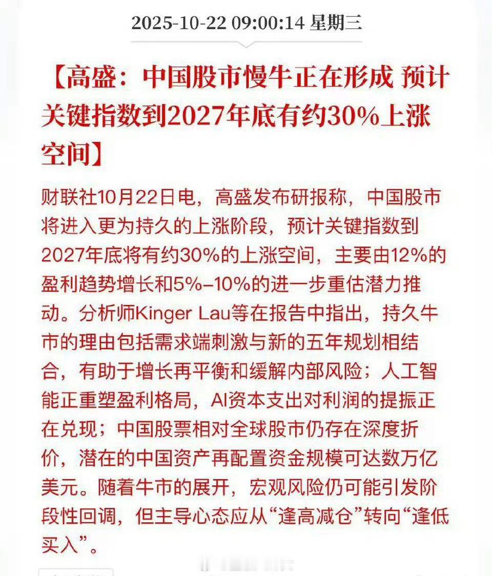 高盛:中国股市慢牛正在形成,预计关键指数到2027年底有约30%上涨空间[并不简