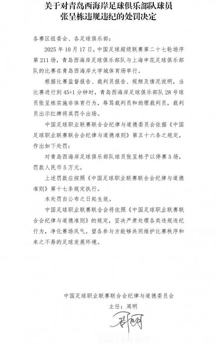 张呈栋的罚单张呈栋禁赛5场罚款5万