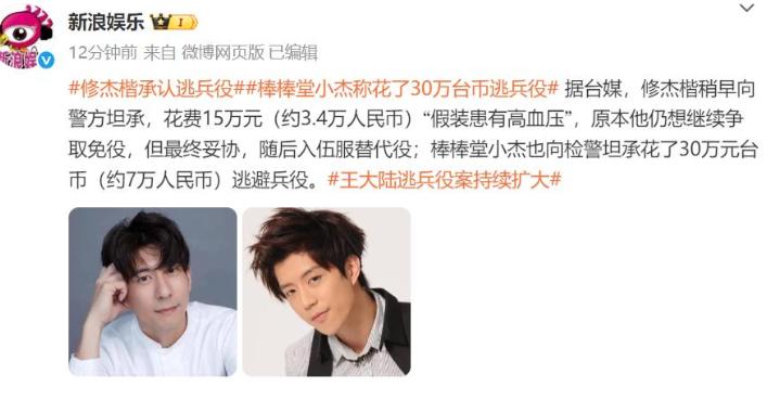 修杰楷陈柏霖被警方上铐带走,竟和王大陆逃兵役有关! 10月21号那天,热搜上突然爆出“修杰楷和陈柏霖被警方拘提”的消息。 更让人没想到的是,台湾警方这回的阵仗真不小,像陈柏霖、修杰楷这些有名的艺人,还有棒棒糖组合的小杰,全都被戴着手铐带走了,现场闹得挺乱。 网友们刷到消息都懵了,在网上一个劲说“这也太突然了,真是半点预兆都没有”。 先说说修杰楷被带走时的样子,他穿了一身黑衣,头上戴着渔夫帽,脸上还捂了口罩和墨镜,把自己遮得严严实实的。 他的手腕一直端着,手上还盖了件衣服,明眼人一看就知道是戴了手铐,看这阵仗,事情肯定不简单。 估计不少人都纳闷,这几个人好端端的,怎么说被带走就被带走了?其实按中国台湾网的说法,他们被抓压根不是偶然,全是“王大陆逃兵役事件”扯出来的连锁反应。 原来之前王大陆为了不用去服兵役,花了上百万台币找“黄牛”伪造假病历,本以为能蒙混过关,结果帮他办手续的人被抓了,这事也跟着败露,上层知道后特别生气,就开始全面调查这件事。 谁能想到,到了10月份,这第三波调查的威力比上次还大,一下子把这么多知名艺人都牵扯了进来。 在所有被带走的艺人里,最让网友摸不着头脑的就得是修杰楷了。 大家都知道,他在2016年5月份的时候,被分配到新北市民政局服替代役。服兵役期间,他特别配合,当时大家都觉得他挺遵守规定的。 过了5个月,贾静雯被曝出怀上了第三胎,修杰楷就申请提前退役,之后回了家。 按照规定,役男如果有两个未满12岁的子女,而且配偶怀孕6个月以上,是可以申请提前退役的。 按说修杰楷的手续都是合规的,怎么现在还会被带走呢? 后来有台媒报道,修杰楷这次被带走,根本不是因为妻子怀孕申请提前退役的事。 真正的问题出在他本该正常服役的时候,为了逃避,他伪造了高血压病历,之后才被分配去服“替代役”,就是那种身体有病但不算严重的人服的兵役。 也就是说,他在服“替代役”之前,就已经造假了。 说起修杰楷和贾静雯,两人是2014年好上的,当时修杰楷比贾静雯小9岁。 2015年5月,他们官宣了怀孕的消息,之后就注册结婚,到了8月,女儿小咘咘就出生了。 婚后两人一直过得挺幸福,修杰楷对贾静雯和前夫生的大女儿梧桐妹也特别包容和疼爱,谁能想到现在会出这么一档子事。 2016年10月,贾静雯官宣怀上了修杰楷的第二个孩子,也就是法律上的第三胎,当时的情况正好符合提前退役的条件。 只是谁也没料到,这事都过去9年了,现在竟然又翻出来找上修杰楷,这反射弧也太长了。 有记者联系到了贾静雯,她现在正在厦门拍戏,没在台北的家里。 贾静雯表示,孩子们都被吓得不轻,她现在特别担心家里的情况。 有意思的是,网传王大陆、陈柏霖和修杰楷这三个人,私下里还是好朋友,以前经常一起聚会。 现在三人因为同一件事被“一锅端”,估计以前私下里也没少讨论怎么躲兵役的事,现在集体被抓,真是一点都不冤枉。 大家怎么看呢?