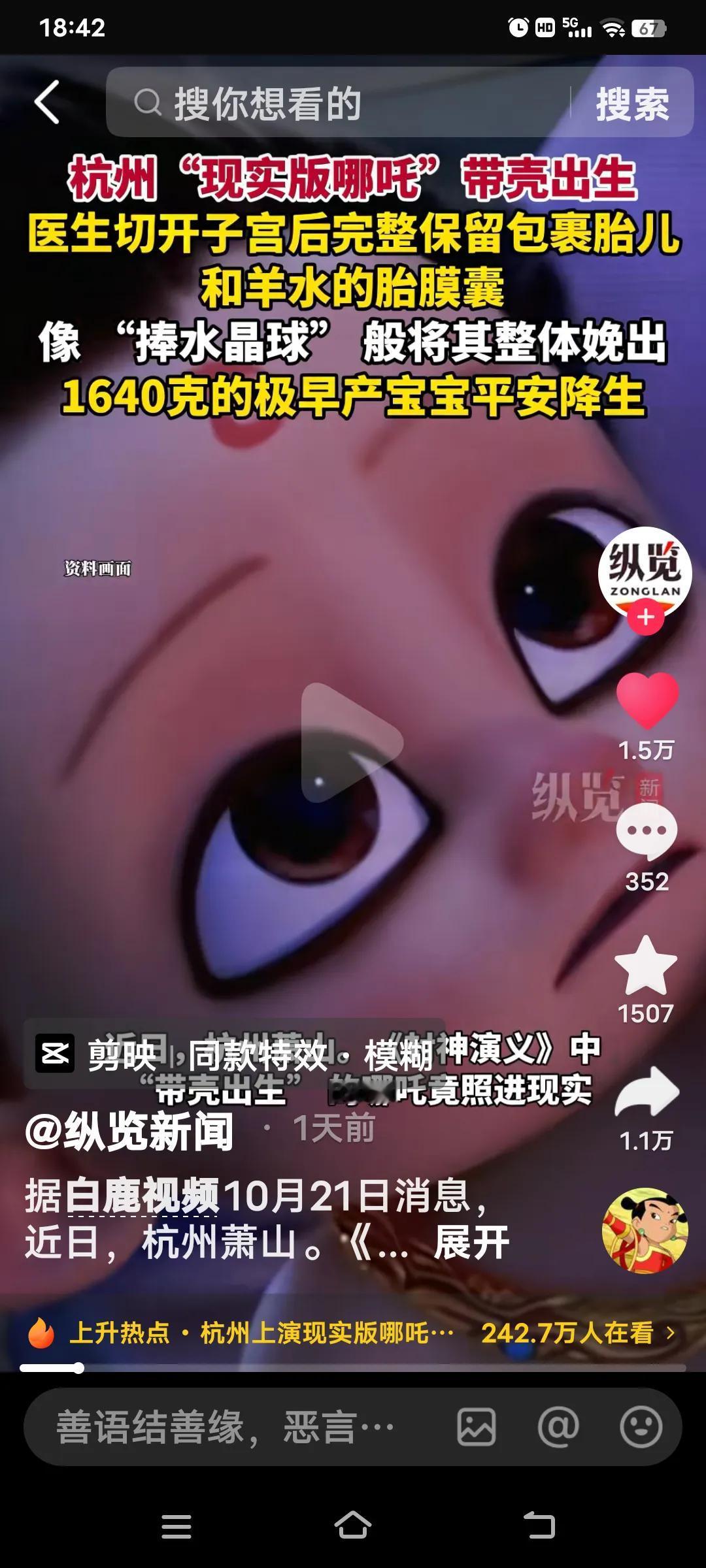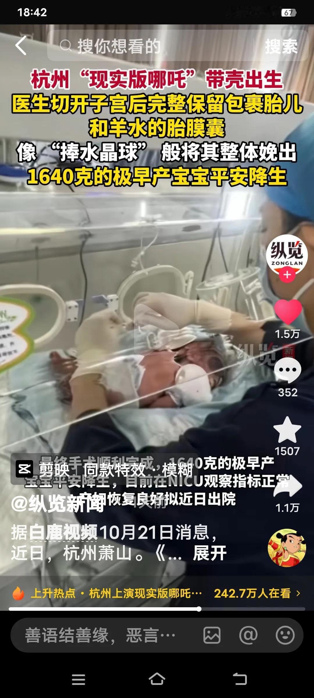 杭州真就惊现“现实版哪吒”,带壳出生。一位25岁王女士孕32周时血压飙升,还并发罕见HELLP综合征,胎儿和母体都很危险。 浙江萧山医院医疗团队为避免传统手术损伤早产宝宝大脑和血管,采用“保留胎膜囊剖宫产”技术,像“捧水晶球”一样把包裹着胎儿和羊水的胎膜囊整体娩出,再破膜迎接小生命。最终1640克极早产宝宝平安降生,目前指标正常,产妇也恢复良好。 其实“现实版哪吒”并非个例,台州恩泽医院、海南医科大学第一附属医院都有类似情况。这项手术难度大,但对早产儿好处多,能避免气压骤变冲击,真的是医学奇迹!哪吒新生儿 哪吒产房 无创胎儿性别