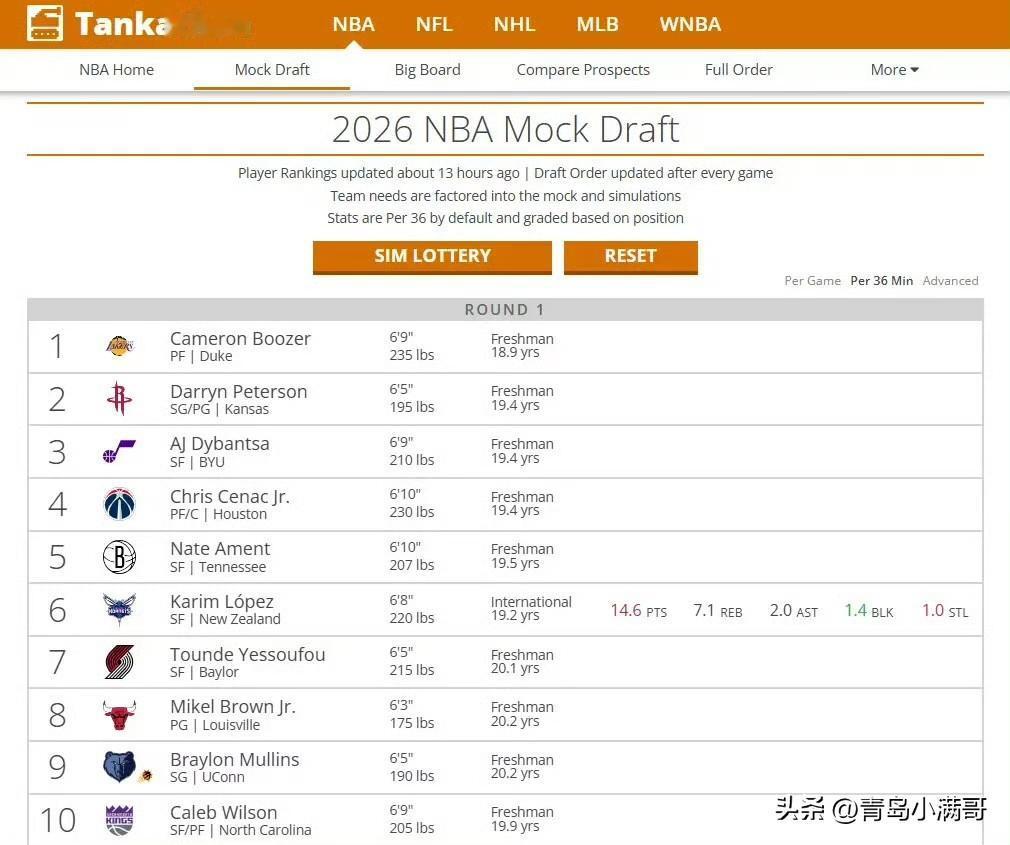 这才打完第一场比赛啊!!!国外模拟选秀网站预测湖人将获得2026年选秀大会状元!