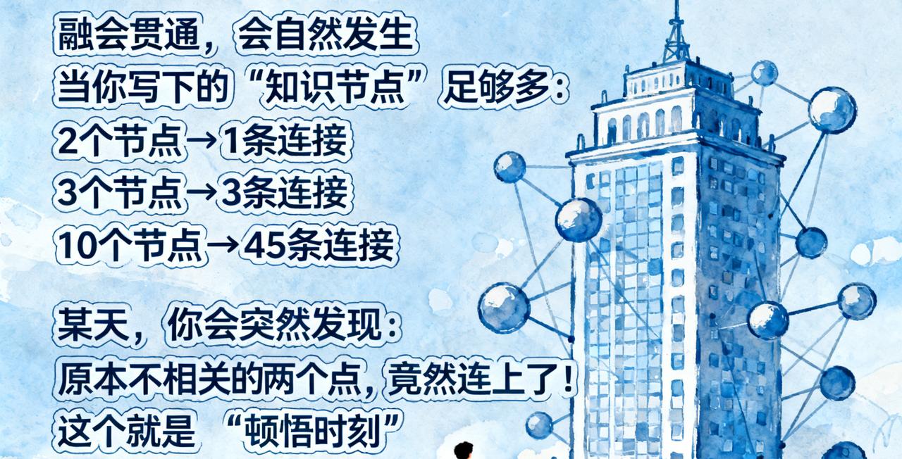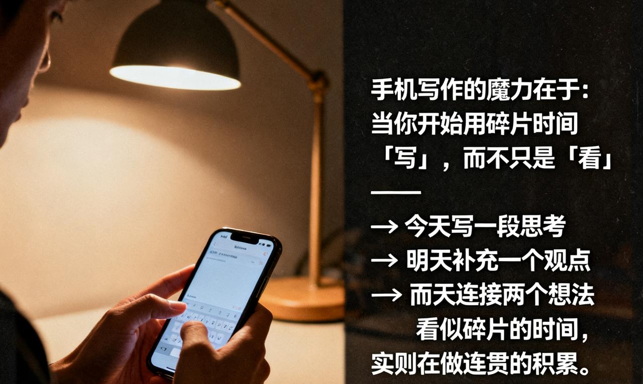 为什么我坚持用手机写作? 很多人以为碎片时间只能刷刷信息 其实,碎片时间最该做的是——写作 ━━━━━ 💡 一个误区 碎片化的信息≠碎片化的学习 就像砖瓦是散的,但盖房子的过程必须是连贯的 真正会学习的人, 都在用碎片时间做长期连贯的事 ━━━━━ ✍️ 手机写作的价值 等地铁时写两句 午休时写一段 睡前整理今天的思考 看似碎片,实则是在: • 把脑子里的想法固化成文字 • 让不同领域的知识产生连接 • 一点点搭建自己的知识体系 ━━━━━ 🔗 最美妙的时刻 当你写够了足够多的「节点」 那些看似无关的想法 会在某个瞬间突然串联—— 这就是融会贯通 这就是体系自动形成 ━━━━━ 🌟 我的策略 莫问前程,但行好事 不纠结今天写的有没有用 只管把想到的写下来 积累到一定程度 惊喜会不请自来 手机,不只是娱乐工具 更是编织知识体系的最佳载体