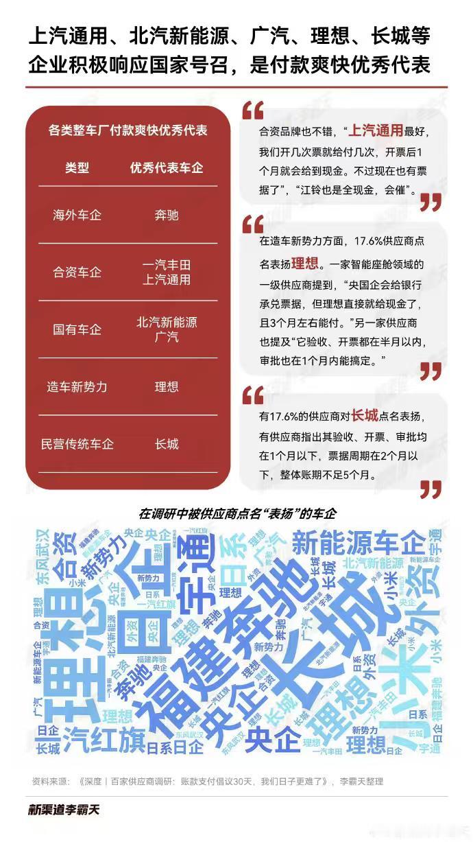在汽车供应链里,不少车企付款方面挺给力的。海外车企里奔驰表现不错;合资车企里,一汽丰田、上汽通用很靠谱,有供应商说上汽通用开票后约 1 个月就能拿到现金;国有车企里北汽新能源、广汽很积极;造车新势力里理想很实在,直接给现金,审批也快;民营传统车企里长城也被夸,验收、开票、审批都在 1 个月内搞定。这些车企的付款表现,对供应商来说可太关键了。