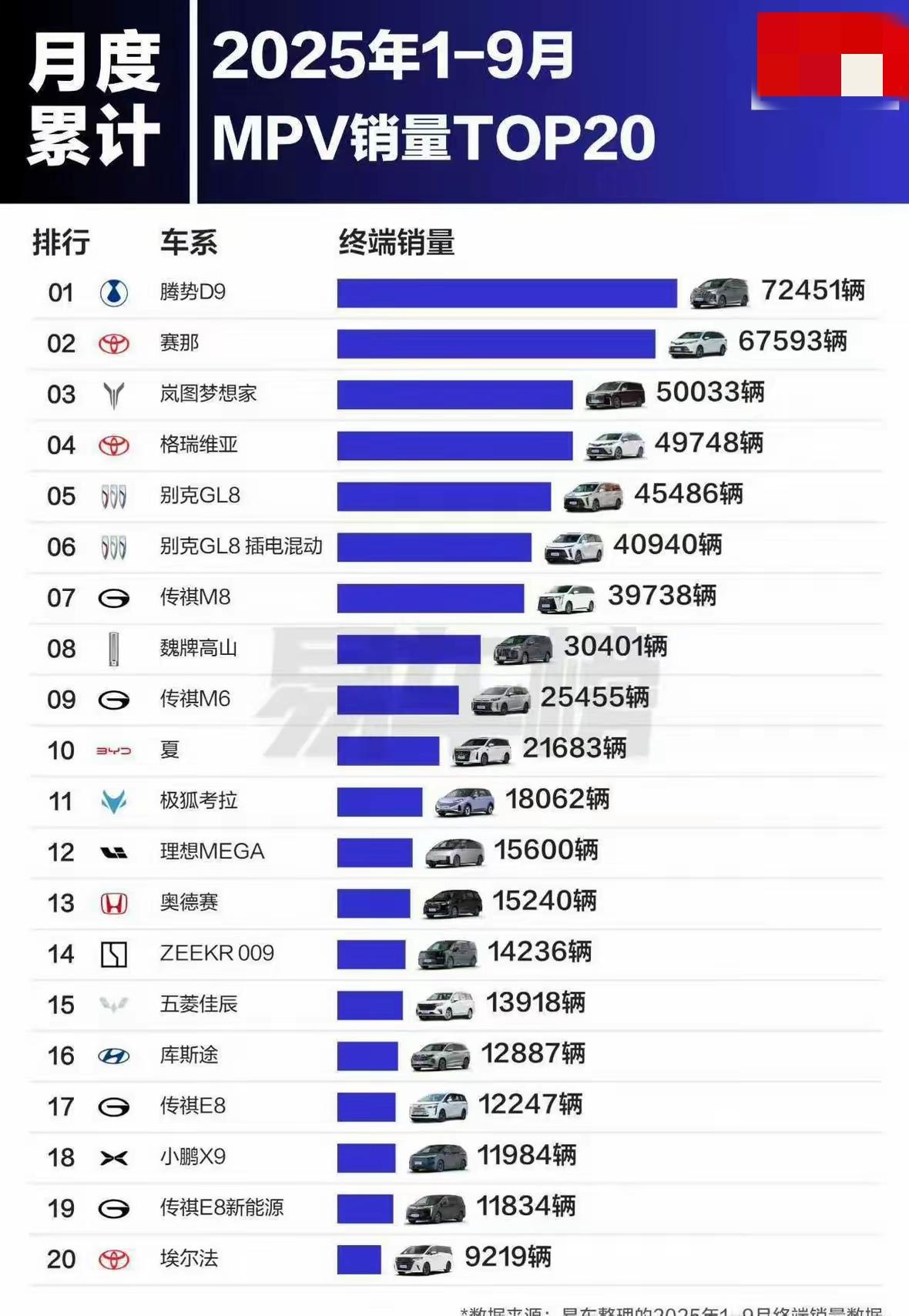 中国MPV市场悄然成型,合资车逐渐落于下风,新势力车企崛起! 1. 新能源车型崛起,传统燃油车份额下滑 - 腾势D9(新能源)以72451辆的累计销量稳居2025年1-9月榜首,岚图梦想家、魏牌高山等新能源MPV也进入累计销量TOP10; - 传统燃油MPV“霸主”别克GL8累计销量(45486辆)已落后于多款新能源车型,9月零售销量中,别克GL8 PHEV(插混)销量(7017辆)也高于燃油版GL8(4260辆),体现新能源MPV对传统燃油车型的替代效应。 2. 市场竞争格局多元化 - 日系(赛那、格瑞维亚、奥德赛)、自主新能源(腾势、岚图、魏牌)、美系(别克GL8)、自主燃油(传祺M8/M6)等多阵营车型参与竞争; - 累计销量TOP20中,新能源车型占比超半数,且涵盖插混(如别克GL8插混)、纯电(如极狐考拉、理想MEGA)等技术路线,市场选择更丰富。 3. 单月销量波动与产品周期相关 - 9月零售榜中,赛那以8168辆登顶,魏牌高山、别克GL8 PHEV等车型单月表现亮眼; - 对比累计销量,部分车型单月销量占比高(如赛那累计67593辆,9月贡献超12%),反映头部车型在销售周期内的集中发力特点。 4. 高端与家用市场双线增长 - 高端MPV(如腾势D9、岚图梦想家、理想MEGA)凭借智能化、豪华配置抢占市场; - 家用MPV(如传祺M6、五菱佳辰)以高性价比维持稳定销量,满足不同消费层级需求。