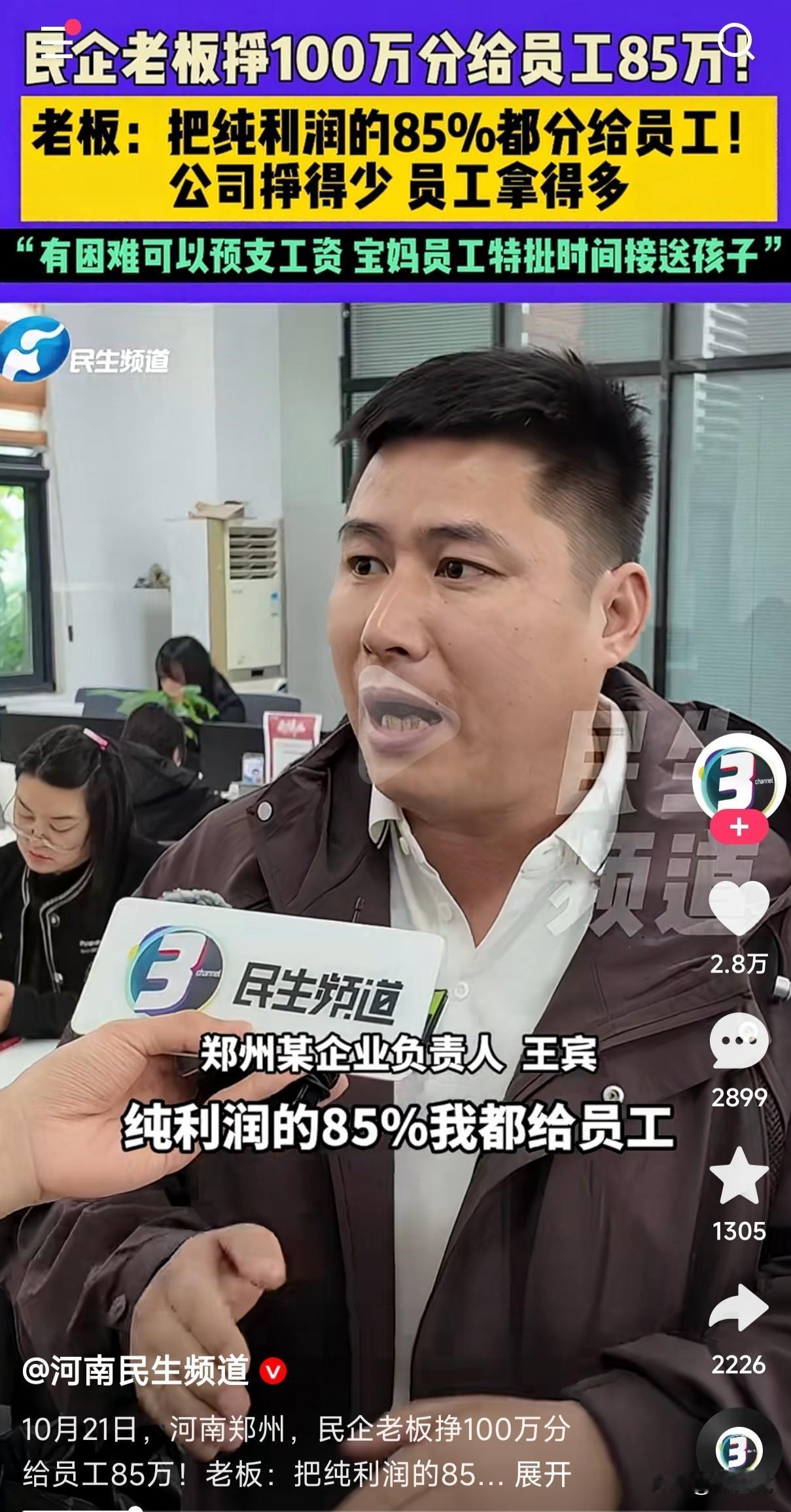 河南郑州民企老板挣100万,分给员工 85万,公司挣的少,要让员工拿的多,有困难还可以提前预支工资,这样的良心民企老板你羡慕吗? 这样的民企老板不发财都难,最应该让这样的良心企业,得民心的企业老板发财,这才是为员工考虑,如果没有员工,也就没有他发财的企业,甚至他还可以提前预支工资,先不说其它的,就他能给员工提前预支工资,单凭这一点敢问哪个企业老板能做到?敢问谁能和他比,这样的民企老板对于打工族来说能不爱吗? 这才是真正的良心企业家,相对那些克扣工资的企业来说,这位河南郑州的民企老板就是他们的榜样,应该向这位老板学习,才能留住员工,公司才能发财,留不住员工的公司能发财吗?