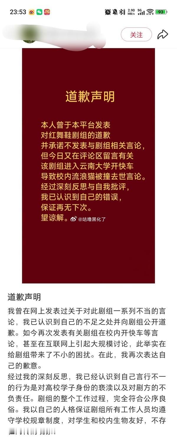 有网友说云南大学有一只流浪猫被红舞鞋剧组撞去世了,剧组还没回应,没道歉,结果有学生向剧组道歉了,是因为承诺不发表剧组相关言论却发布了[允悲]