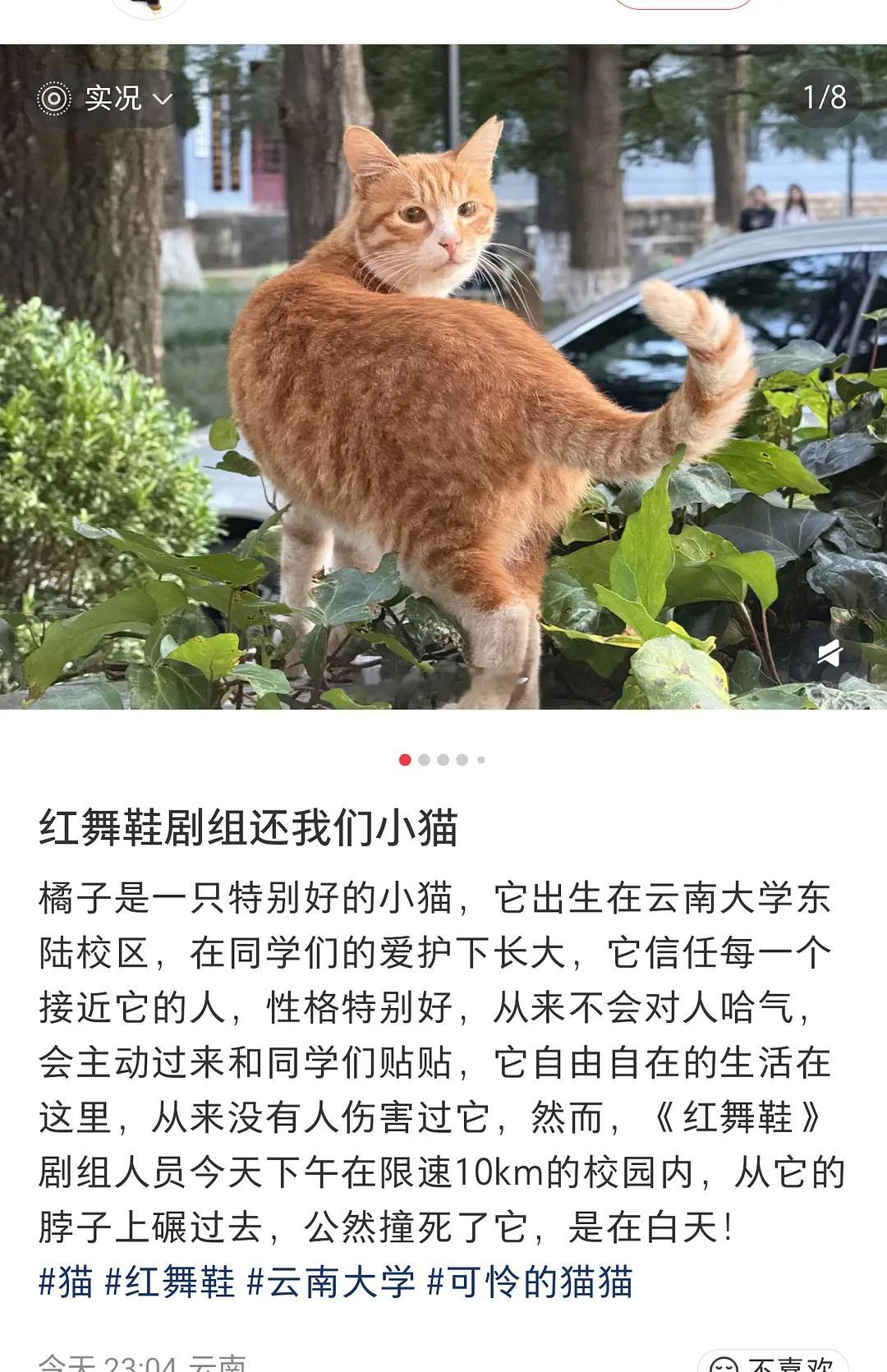 有网友说云南大学有一只流浪猫被红舞鞋剧组撞去世了,剧组还没回应,没道歉,结果有学