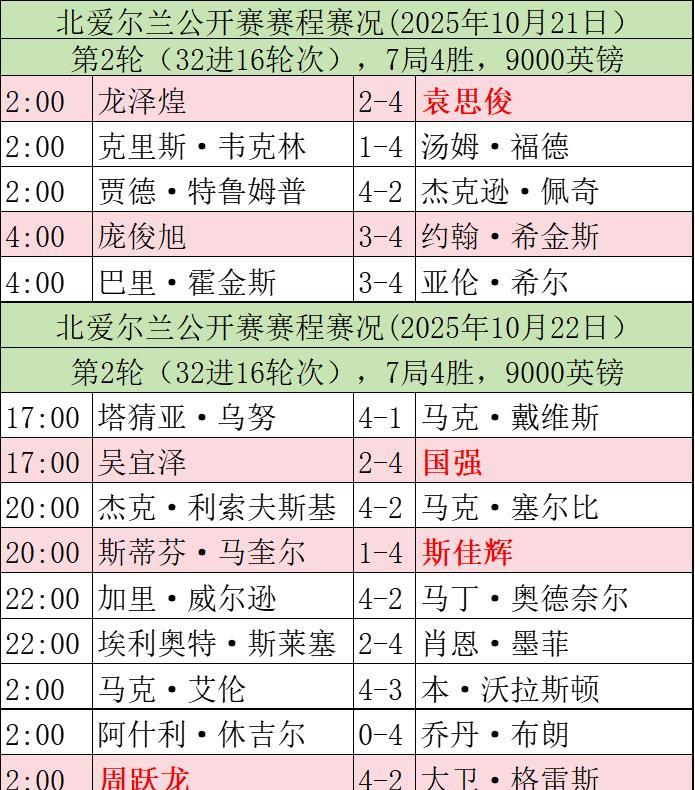 斯诺克赛场,今日赛程,2025年10月23日 2025斯诺克北爱尔兰公开赛1/8决赛。 在32进16轮次的比赛中,中国选手斯佳辉、袁思俊、周跃龙和贺国强强势晋级16强。 本轮仍是7局4胜,奖金13200英镑。 20:00袁思俊,22:00斯佳辉、明日凌晨2点周跃龙和贺国强出战。 具体赛程,参见附图表。 #2025斯诺克北爱尔兰公开赛# #斯佳辉# #袁思俊# #周跃龙# #贺国强#