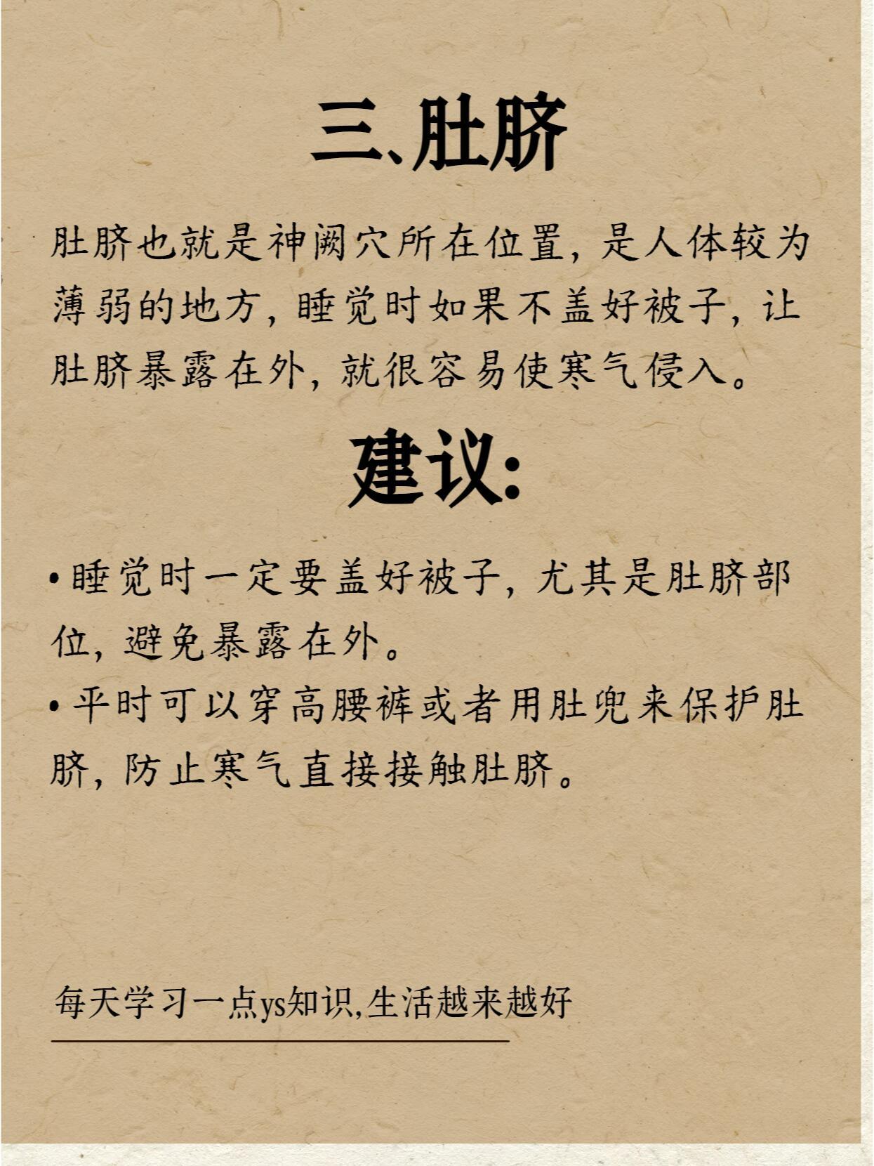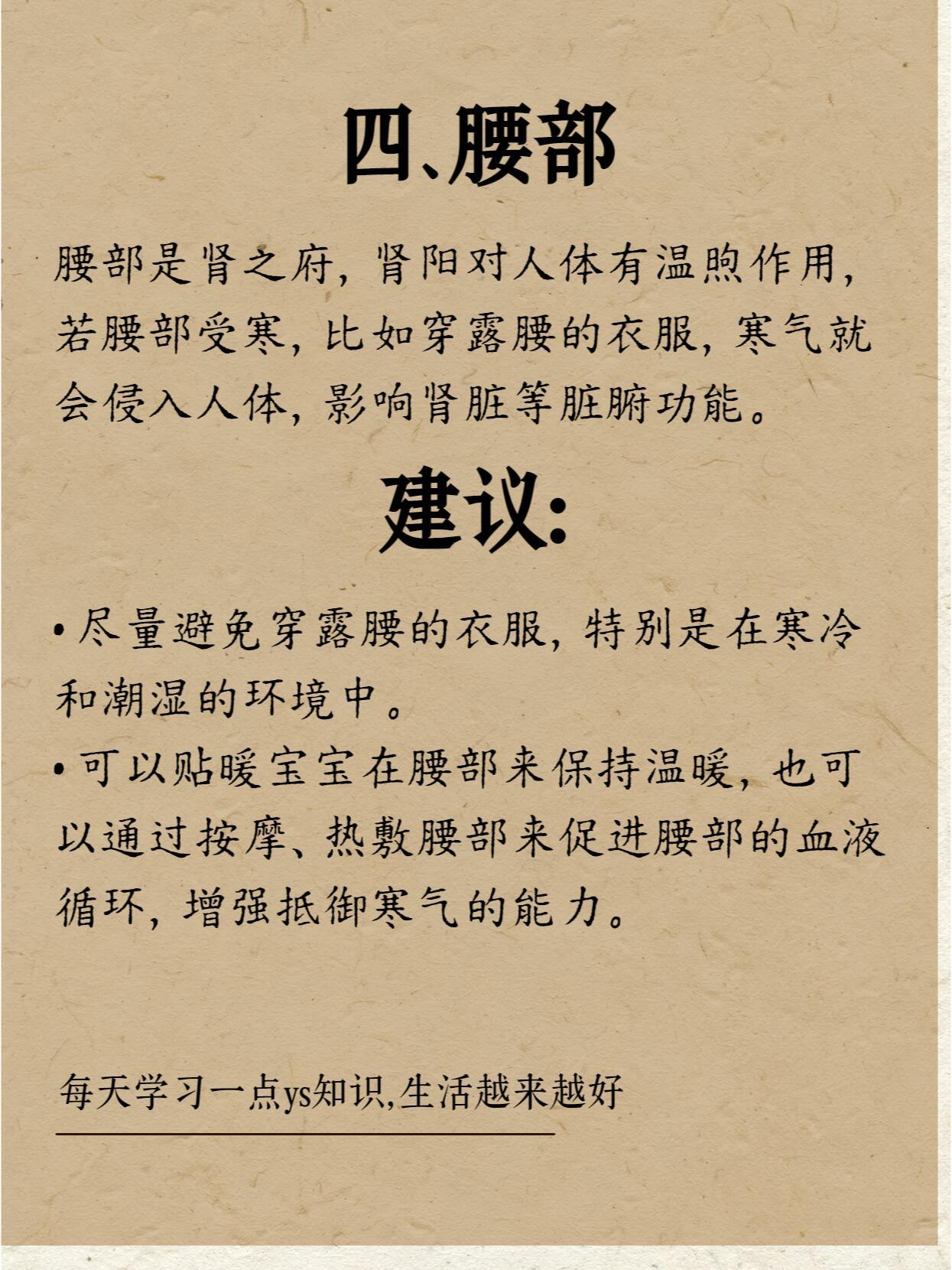 2. 腰腹:中医认为“腰为肾之府”,后腰命门穴和腹部丹田是阳气中心,暖宝宝或护腰能快速升温。