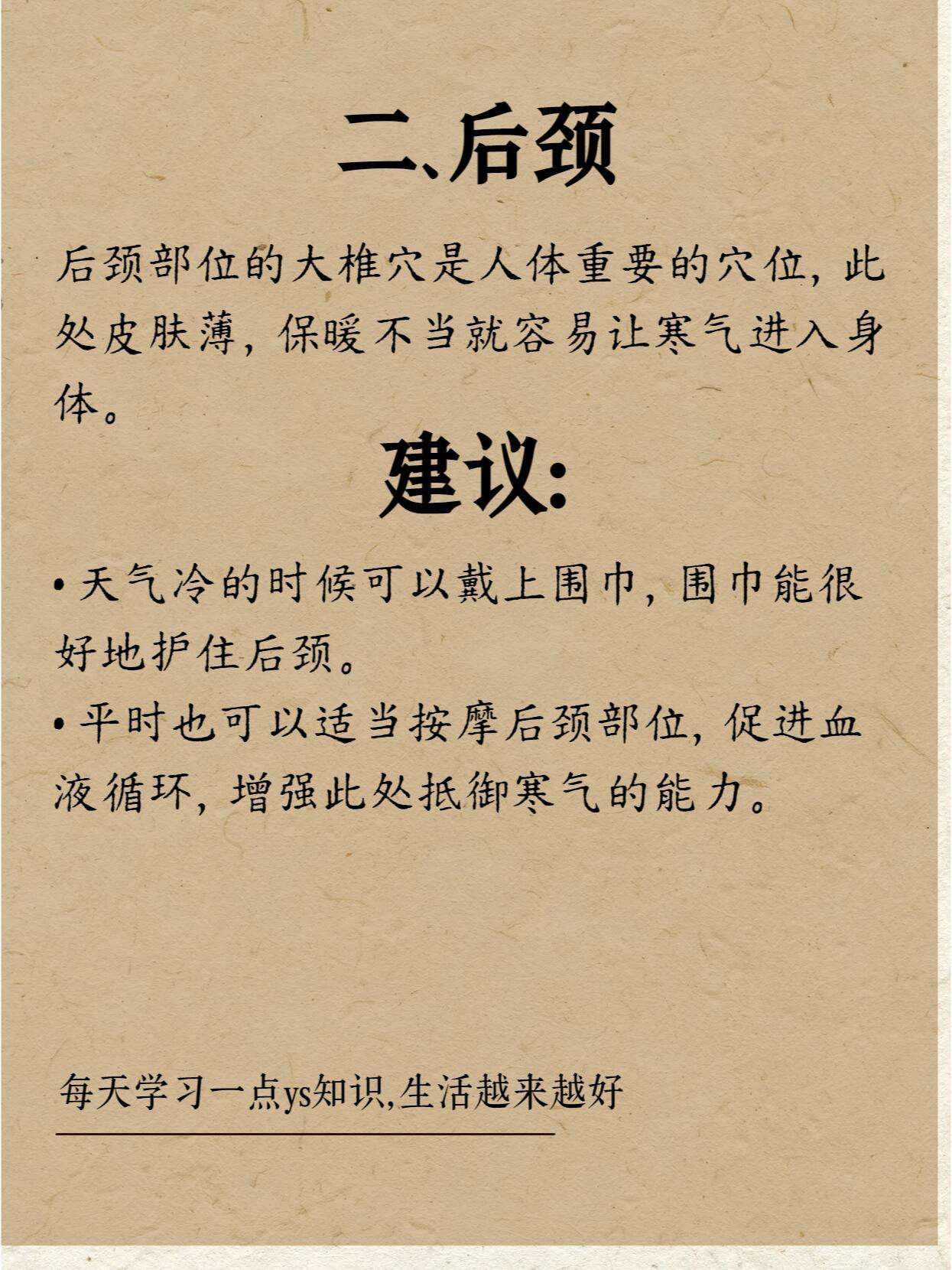 1. 脖子:这里血管神经密集,冷风一吹全身都凉。一条围巾就能护住上半身。