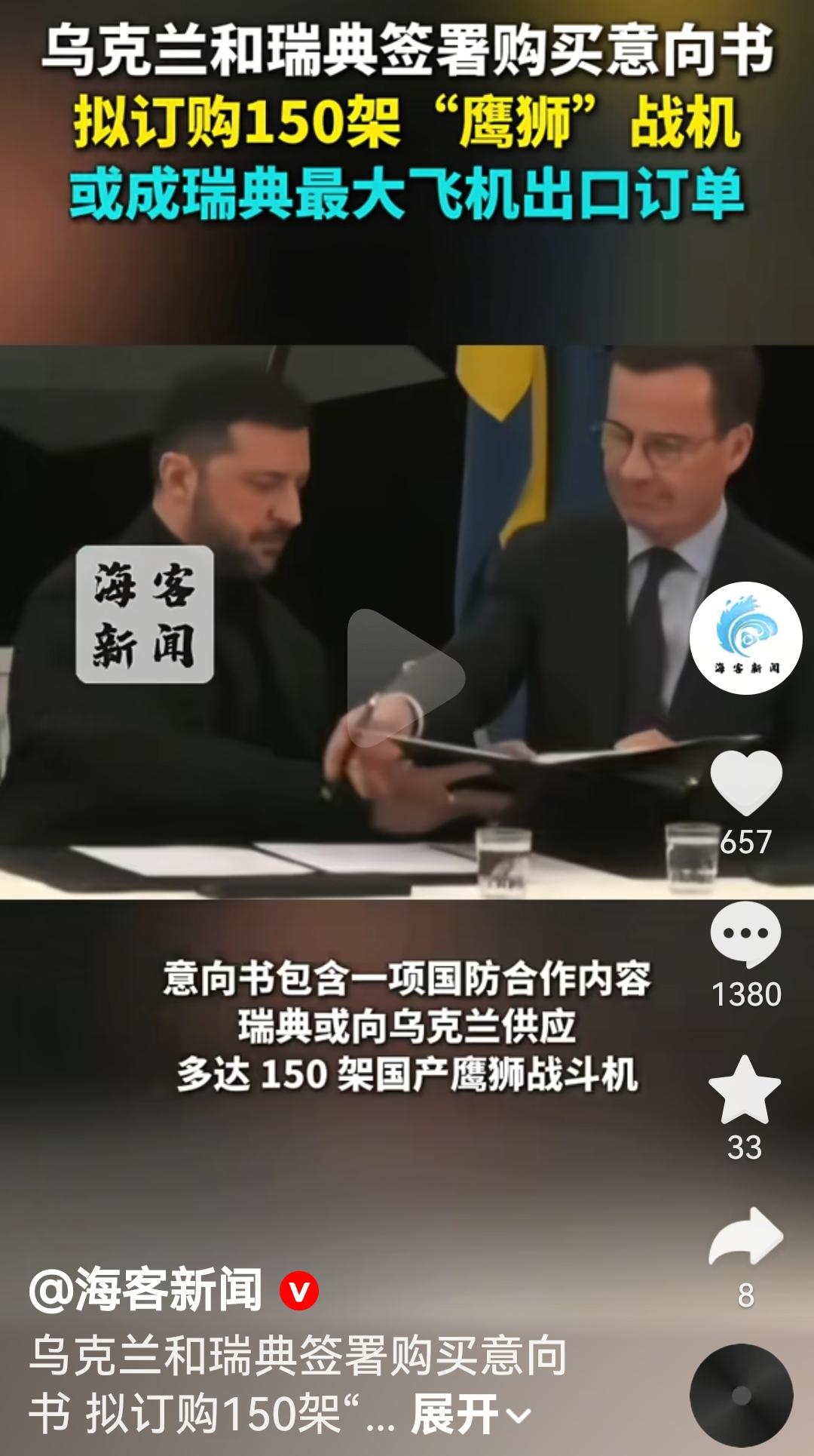 乌克兰越打越有钱了吗,直接买150架战机 根据媒体报道,10月23日乌克兰总统泽连斯基和瑞典首相克里斯特送签署了一份军购协议 瑞典将按协议向乌克兰供应150架鹰师战机,这是瑞典军售有史以来最大飞机订单 乌克兰拿啥买啊,该卖的都卖了,还是以前买的订单各种抵押,打仗这么长时间了还一次性买这么多美国军售乌克兰 丹麦对乌援助 北约高官访基辅 丹麦对乌军援 图片来自海客新闻视频