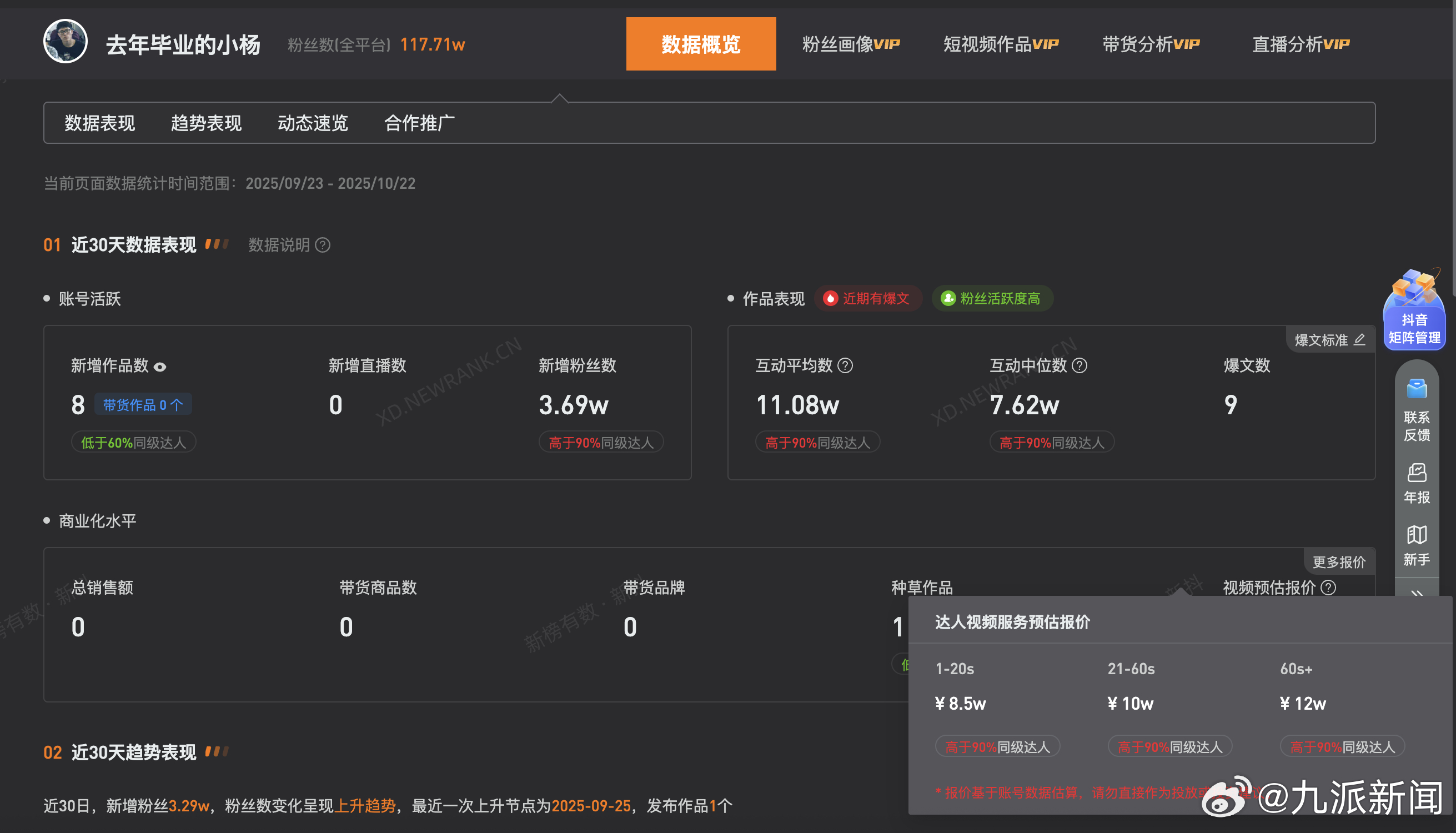 【#卖潮玩烧饼小伙1分钟视频报价12万元#】10月23日,“河南小伙卖潮玩烧饼10分钟被抢光” 话题登上热搜,引发网友关注。据悉,该事件主人公小杨,通过制作各类潮玩烧饼,并以1元的价格售出,深受小朋友喜欢,吸粉百万。查询第三方数据平台发现,截至发稿,“去年毕业的小杨”账号商业化水平显示,其1-20s视频广告预估报价为8.5万元、21-60s视频广告预估报价10万元、60s以上视频广告预估报价为12万元。