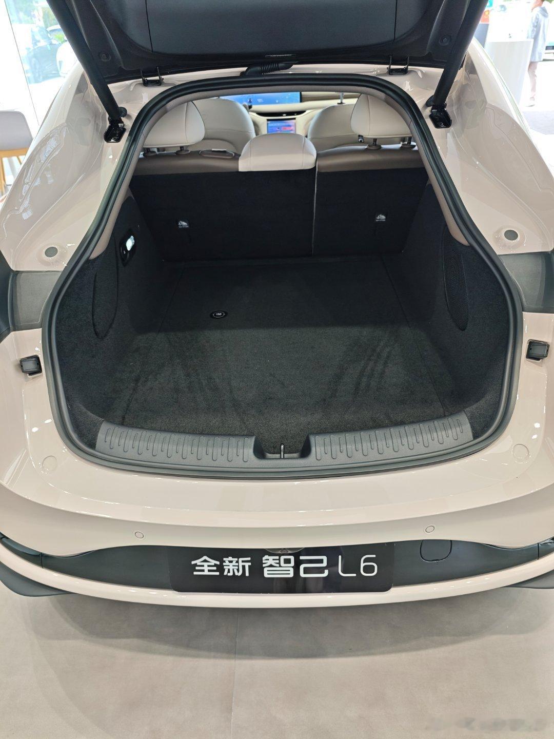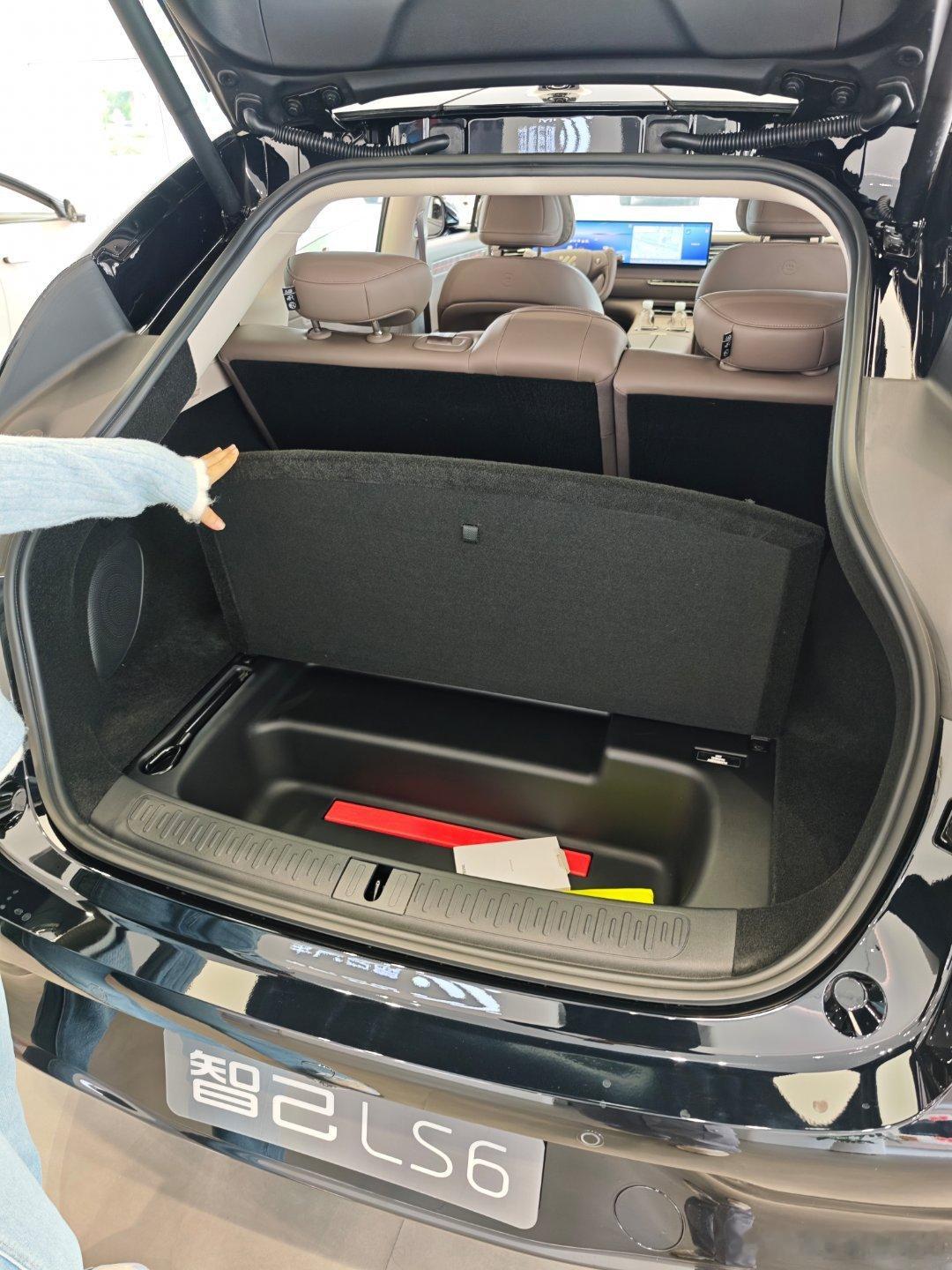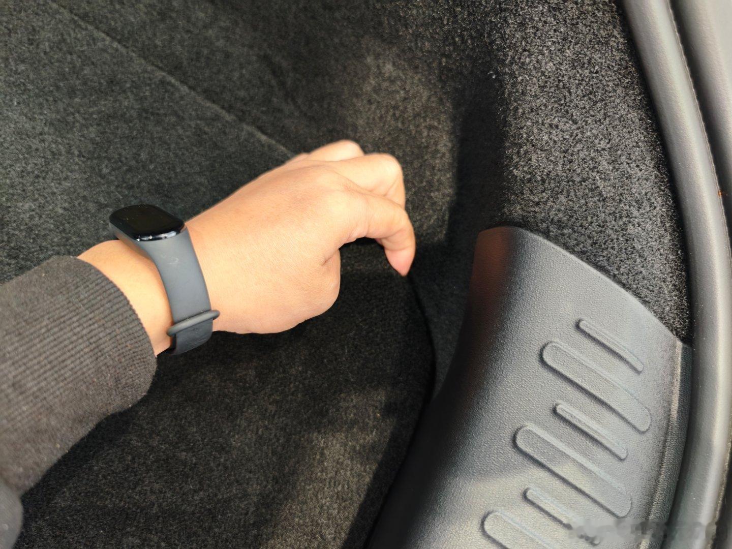 智己L6的尾箱盖板,连个拉手都没有(图2),根本就不是给用户打开的。想开也非常不方便,使用呢绒搭扣粘得挺紧的(图3),需要很用力从缝里扣才行。