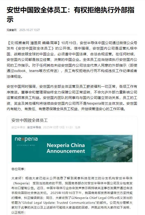 安世的非法CEO来到中国,想要与中国进行协商谈判! 发布禁令后的第6天,荷兰终于坐不住了,宣布愿意就安世半导体事件,与中方进行谈判,接下来被临时上任的安世非法CEO打算亲自到中国。 相比半个月前荷兰一气呵成的动作,这一次明显态度软下来了,不是因为他们不想重新拿回主动权,而是根本扛不住长时间的禁令。 安世这公司根本离不了中国,说出来可能有人不信,这家号称荷兰的半导体企业,80% 的产能都扎在中国土地上,光广东东莞一个封测厂就有 4000 个员工,一年能造 500 亿件芯片,全球一半的销售额都得靠中国市场撑着。 荷兰之前想得挺美,以为接管了管理层就能掌控全局,殊不知芯片生产的命脉早就在中国手里。 中方一发布出口管制,东莞工厂立马就受了影响,原本订单排到下个月的产线,因为原材料和许可问题,不少岗位都改成了上四休三,这还只是开始。 更要命的是安世在全球车规级功率半导体领域的地位,前三强的名头不是白来的,全球 30% 以上的汽车品牌都用它的芯片,从车载传感器到动力控制系统,缺了它车企根本开不了工。 禁令刚实施没几天,安世就不得不给宝马、大众这些巨头发函说要延迟交货,欧洲汽车业直接炸了锅。 欧洲汽车制造商协会急得跳脚,警告说要是月底前解决不了,产业链得断供 3 个月,200 亿欧元的损失说没就没,10 万个工作岗位要打水漂。 大众采购总监都直言不讳,芯片库存只够撑三周,德国沃尔夫斯堡工厂都快停工了,宝马、奔驰的新能源生产线也跟着歇菜,这些车企一闹,荷兰政府耳朵就没清静过。 荷兰自己的日子更不好过,安世可不是小作坊,2024 年营收都 80 亿欧元了,在荷兰本土能提供 2000 个工作岗位,给荷兰半导体产业贡献的税收占比高达 8%。 这还没算连带效应,中方不光卡了安世的出口,连半导体制造必需的重稀土都收紧了管控,要知道全球重稀土精炼能力基本都在中国手里。 荷兰的 ASML 早就尝到苦头了,2025 年第二季度营收直接下滑 12%,中国市场的份额掉得厉害,这连锁反应往深了走,荷兰整个半导体产业都得跟着发抖。 半个月前荷兰还在跟美国一唱一和,借着 “技术安全” 的由头架空中国股东,又是冻结资产又是换管理层,把《物资供应法》这老古董都翻出来了,号称要 “维护欧洲经济安全”。 结果禁令一落地,才发现所谓的安全根本经不起现实考验,自己的产业链先扛不住了。 安世那个临时 CEO 也有意思,上任的时候靠着外籍管理层反水和政府干预,现在却要亲自来中国低头,毕竟公司 80% 的产能都在中国,真要是谈不拢,他这个 “非法 CEO” 连芯片都造不出来。 商务部部长跟荷兰经济大臣通话的时候已经把话说得很明白,这种干预企业经营的做法严重影响供应链稳定,荷兰现在主动求和,说白了就是算清了账,继续硬扛下去,受损的不只是安世,还有整个欧洲汽车业和荷兰本土经济。 美国只负责施压,可不会帮荷兰填 200 亿欧元的窟窿,也不会管那 10 万个即将失业的岗位,荷兰这才反应过来,跟着别人起哄架秧子,最后疼的是自己,只能赶紧派临时 CEO 来中国找台阶下。