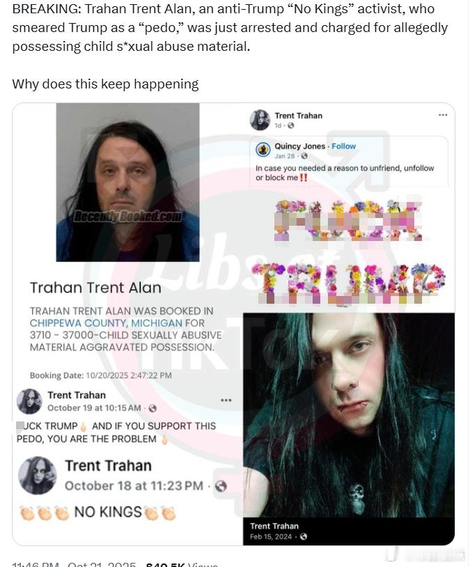 反特朗普的“No Kings”激进分子特拉汉·特伦特·艾伦,曾诬蔑特朗普是“恋铜癖”,如今却因涉嫌持有儿童性虐待材料而被逮捕并起诉。