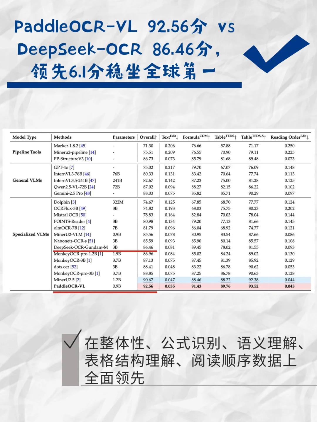✅ 综合得分:PaddleOCR-VL 92.56分 vs DeepSeek-OCR 86.46分,领先6.1分稳坐第一