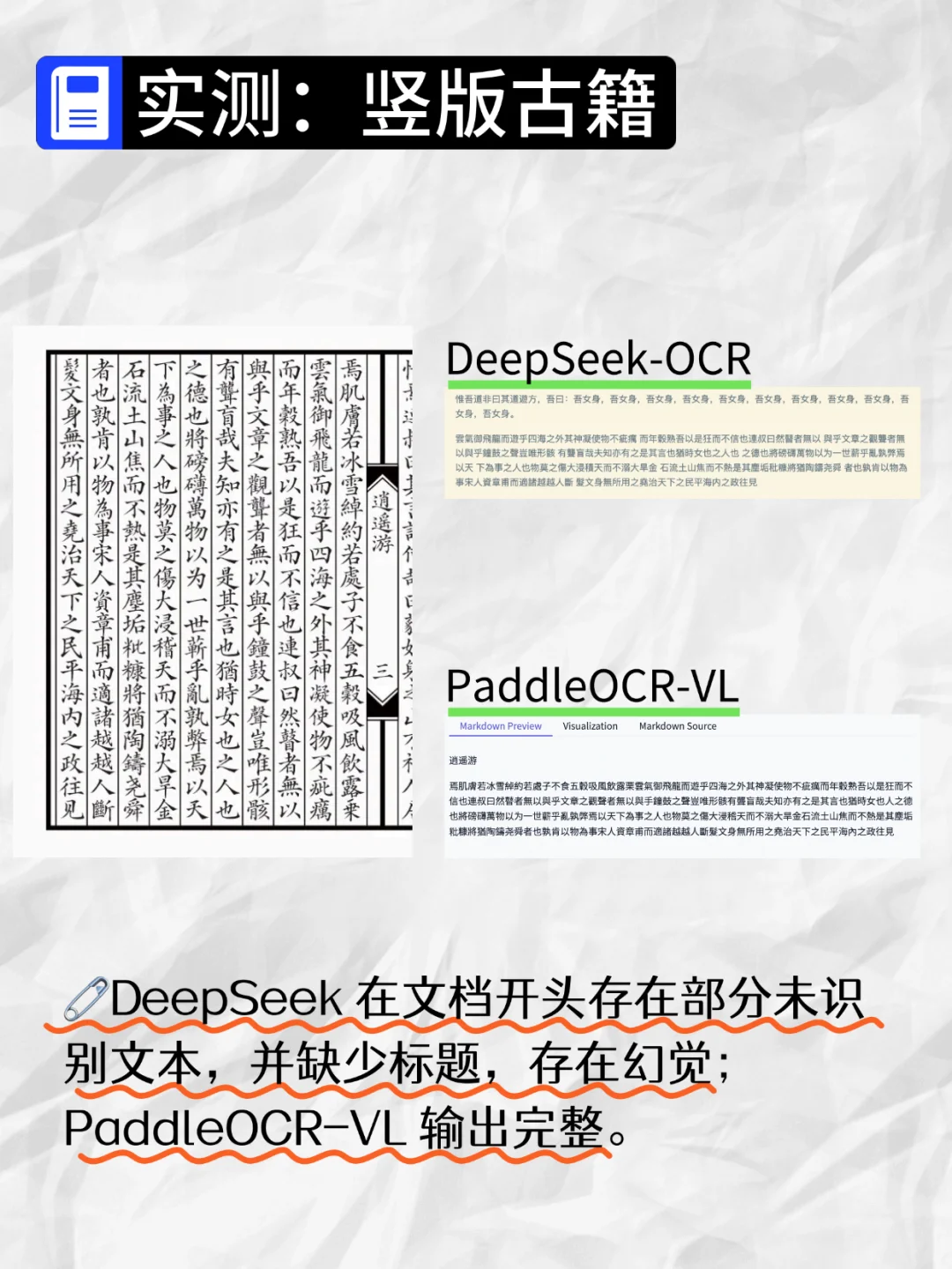 • 竖版古籍:DeepSeek存在部分未识别文本;PaddleOCR-VL 输出完整