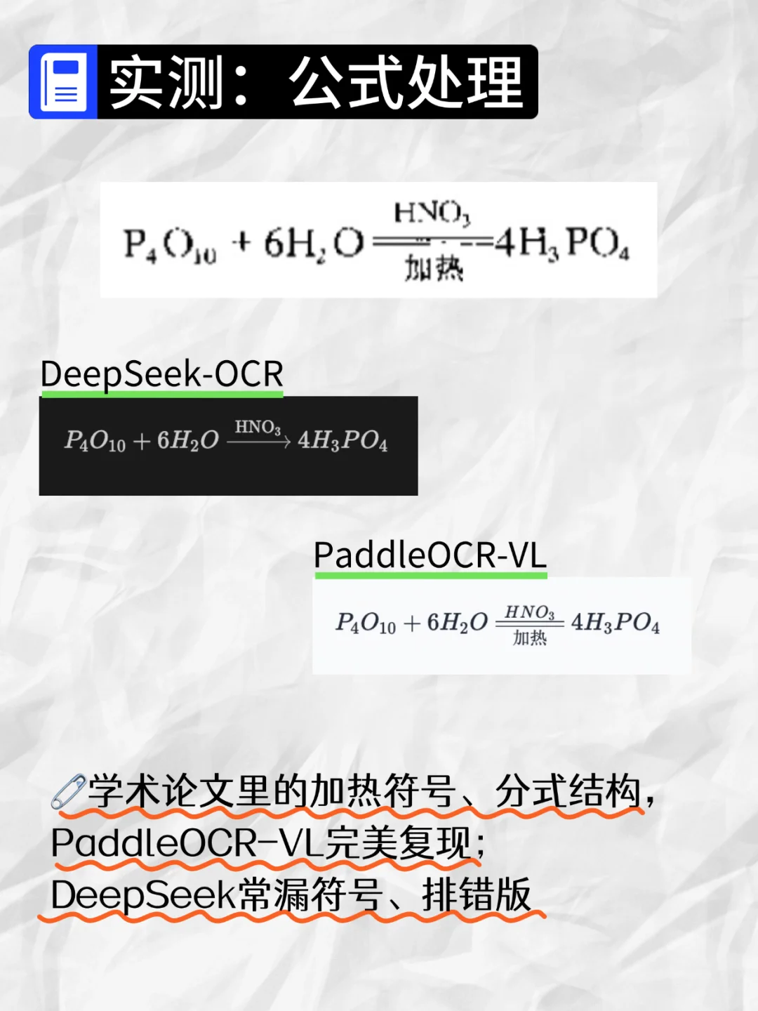 • 公式处理:符号、分式结构,PaddleOCR-VL完美复现;DeepSeek常漏符号、排错版