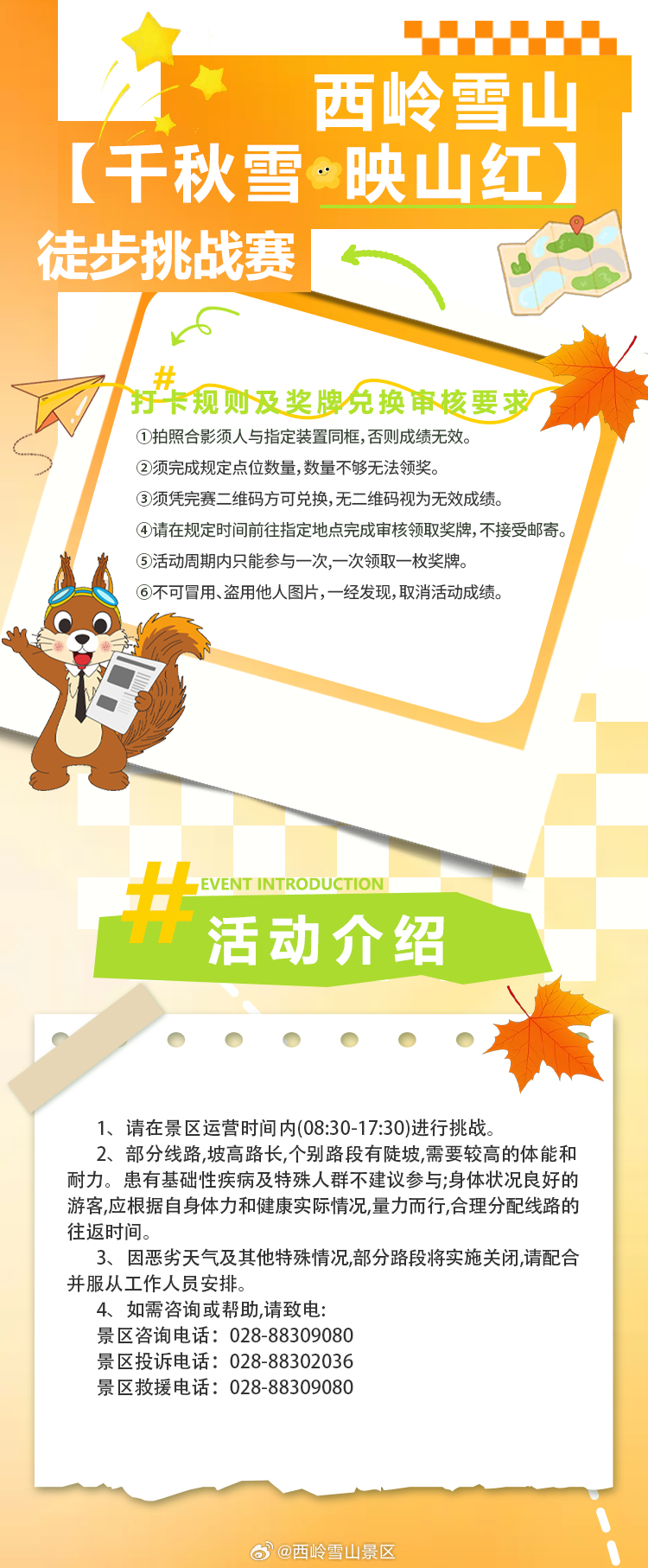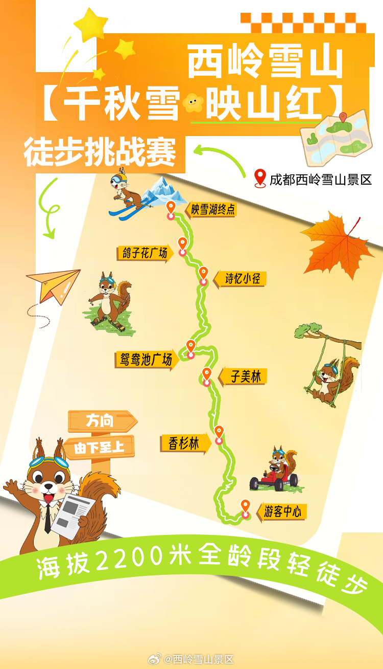 这次的活动主题是“千秋雪 映山红”,是一场超适合全龄段的轻徒步挑战赛哦!海拔2200米的西岭雪山,秋天的景色简直美如画,一边徒步一边欣赏美景,想想就超棒!