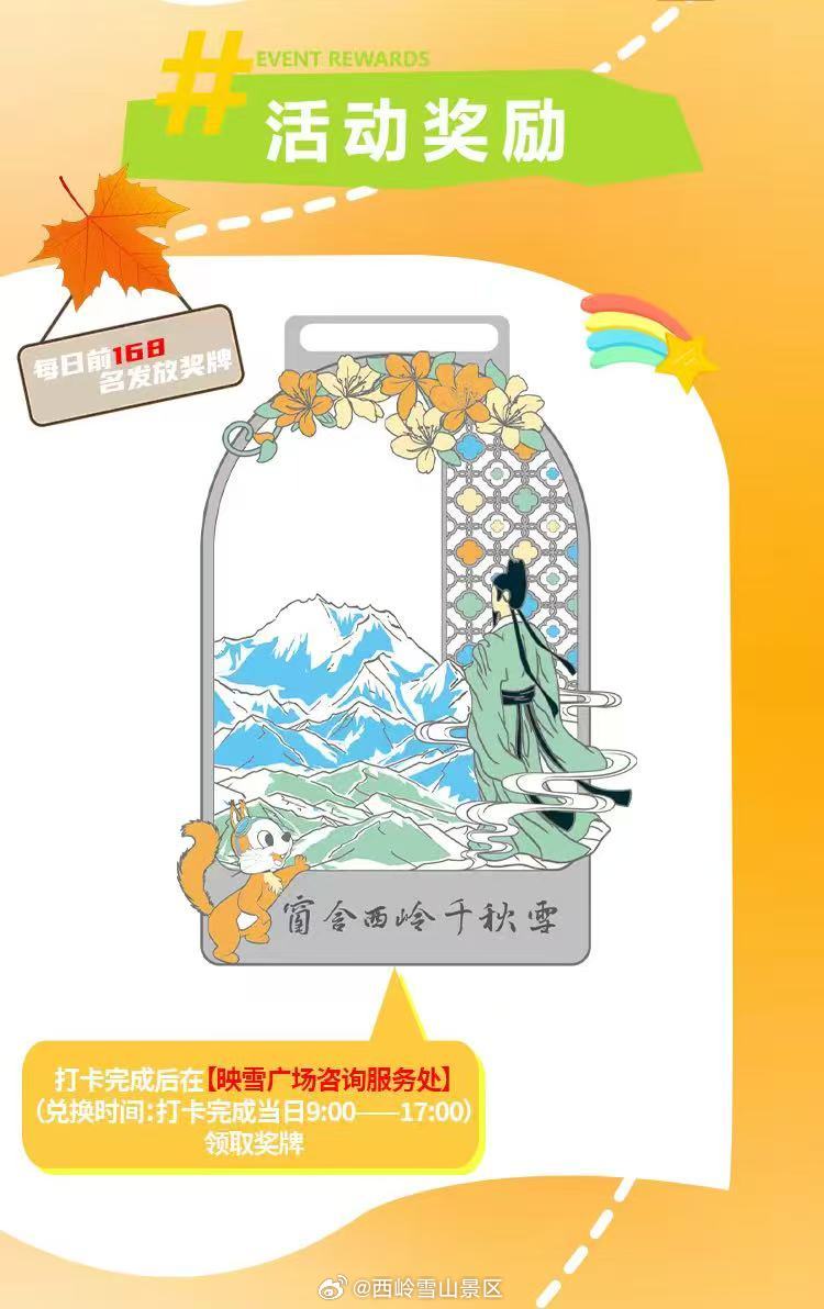 每日前168名完成挑战的小伙伴,能获得西岭雪山官方文创奖牌一枚!这个奖牌颜值超高,上面有西岭雪山的风景和一位古风人物,很有纪念价值~