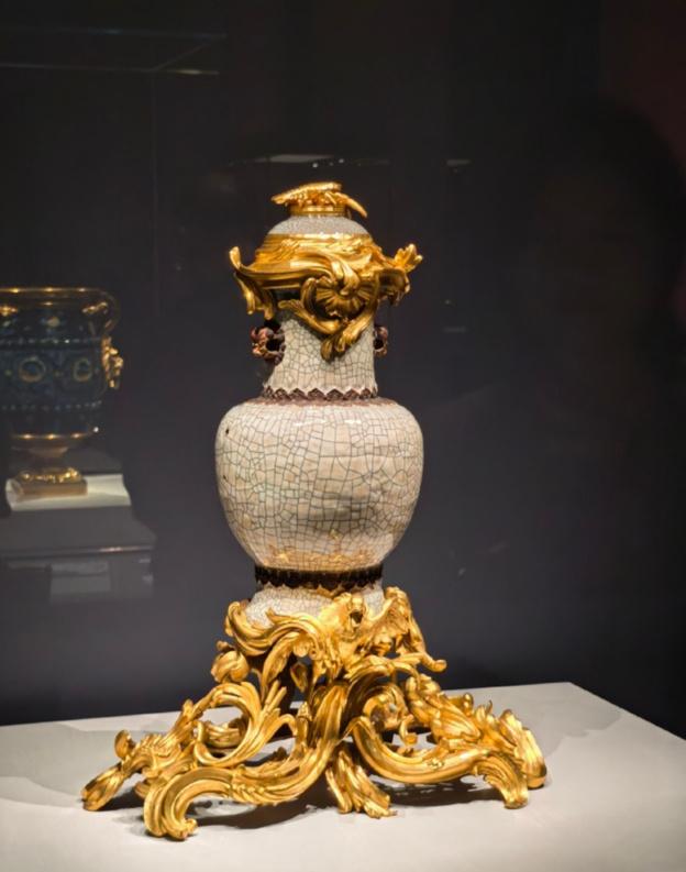 中国瓷器中的路易十四和情妇。“住宅里要是没有中国的花瓶,不能算是一流的住宅。”(笛福)中国自唐代对外出口瓷器,到了明清达到顶峰,法国太阳王路易十四对于中国瓷器爱得情有独钟,不仅搜集、改造了大量瓷器,还特地向中国订购了大批外销瓷(欧洲要到18世纪初才会自己烧制瓷器),路易十四钟爱情人莫内斯潘夫人,于是在定制瓷器中,出现了他和情人在凡尔赛宫花园中散步的场景。图二是路易十五魔改的洛可可风格景德镇仿哥窑瓷瓶。