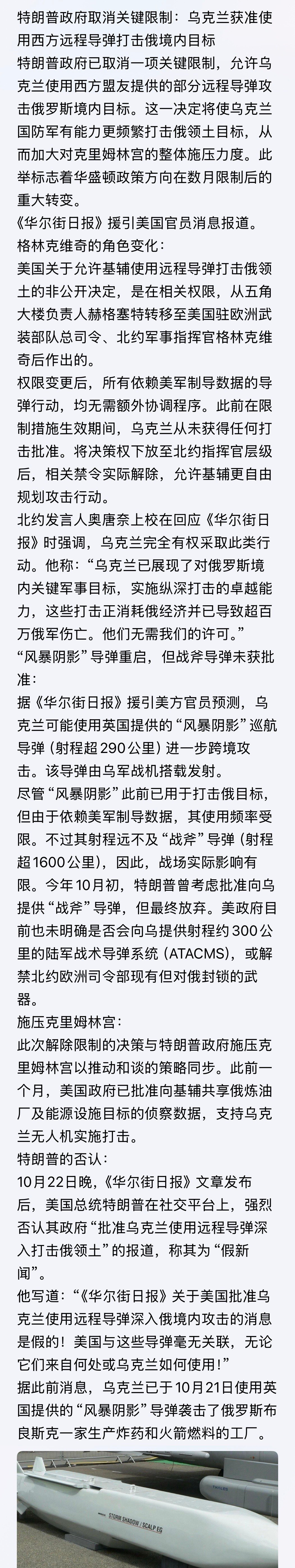 特朗普政府取消关键限制:乌克兰获准使用西方远程导弹打击俄境内目标吕特称,首笔数亿美元款项已支付给美国,用于采购提供给乌克兰的武器。相应数量的武器已从美国发出。并指出,这仅仅是北约对乌军事援助拨款的开端。在“实现长期停火或达成和平协议”后,武器弹药方面的支出将大幅增加。俄乌战争
