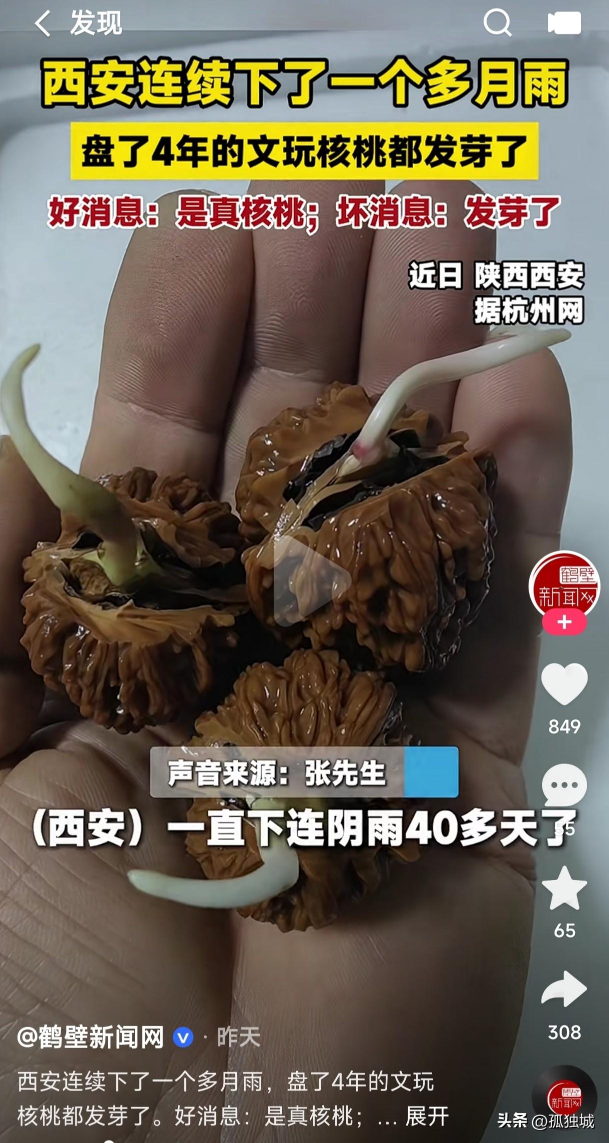 西安网友盘了4年的文物核桃居然发芽了 这与连续下了40天的雨有关系吗 为什么我看见这核桃是被锯开的呢 这文物核桃都能发芽 还真是稀奇事 不管是好消息还是坏消息 总之是这文物核桃发芽了 把它栽在地里 多年以后是不是能长出好多这样的文物 那岂不是发大财了 文物核桃都能发芽 这种稀奇事你见过吗