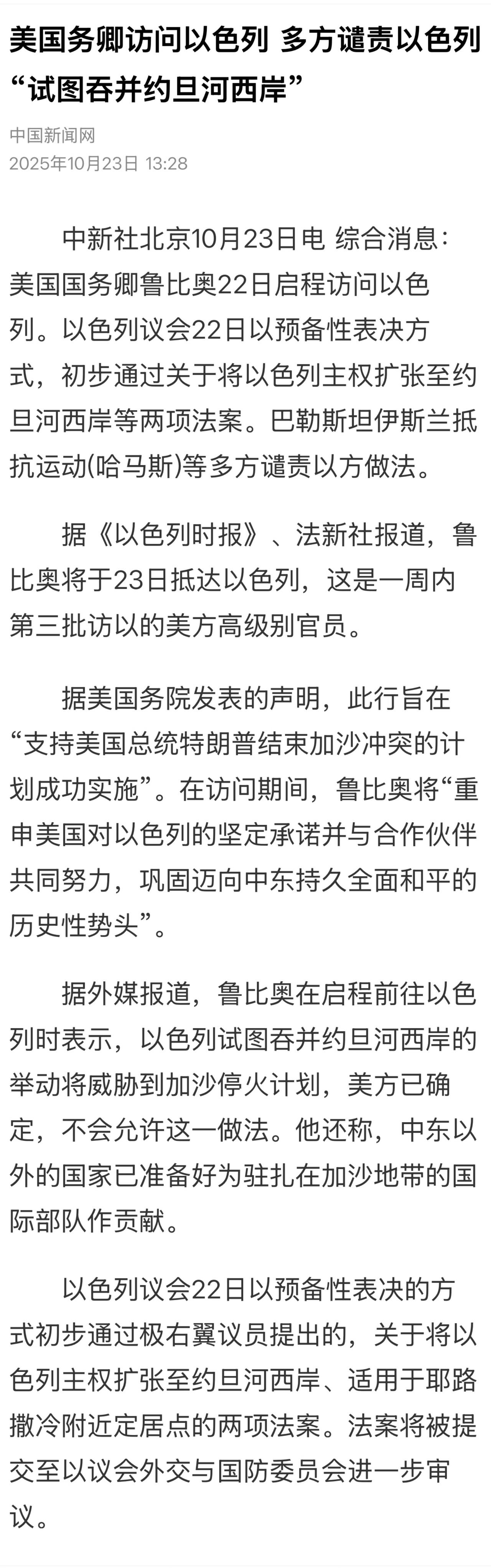 美国务卿警告以色列吞并约旦河西岸恐危及加沙和平协议