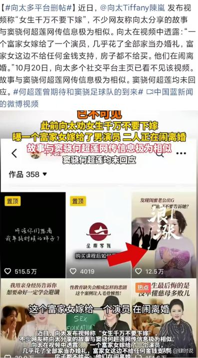 窦骁何超莲到底离没离婚啊! 前两天,向太前脚点赞实锤窦骁何超莲婚变,后又连夜删光视频。 更让人没想到的是,马上就有知情人辟谣“两人感情甚好,已着手备孕”。 把向太的脸打得啪啪响! 10月20日向太在社交账号发的那段视频,她聊“下嫁”这个热点话题时,讲了个豪门千金嫁男演员的事儿。 视频里提到,男方把自己打拼多年攒下的全部身家都拿了出来,办了一场轰动全网的奢华婚礼,可女方家族自始至终没伸过手帮衬一分钱。就连婚后两人住的房子,房产证上写的也全是女方的名字,这明摆着就是女方妈妈打一开始就没认可这个女婿,才特意这么安排的,换谁看都能明白其中的门道。 更让人唏嘘的是,现在男方就算重新出来拍戏赚钱,连当初办婚礼的本钱都还没赚回来,现在又闹感情矛盾,听说这会儿正为离婚的事儿拉扯呢。 虽说视频里没把这对夫妻的名字点破,但向太紧跟着的操作直接把谜底给捅了出来。 有网友在评论区精准猜中是窦骁和何超莲,没成想向太竟然专门给这条评论点了赞,这一下全网都炸了锅,这不就是变相承认了嘛。 网友们再顺着线索一核对,发现所有细节都严丝合缝,何超莲本就是澳门的豪门千金,窦骁恰好是内地男演员,前年他俩办的那场盛大婚礼,当时就有消息说所有开销全是窦骁一人承担的。 更关键的是,从去年开始,俩人就极少在公开场合同框,这些反常的举动,怎么看都透着股不对劲的味道 可话说回来,向太这单方面的爆料也不是没漏洞。 今年窦骁还特意去给何超莲参与的电影站台支持,而且两人至今都没官宣过婚变的消息。 这么一看,向太说的那些细节,和这对夫妻公开的婚姻状况其实存在不少矛盾,所以也有很多网友质疑这个故事的真实性,觉得是不是有什么隐情。 至于向太为什么要突然爆这个料,有网友猜测可能和上个月的事有关。 当时向佐被曝欠下了巨额债务,后来虽然澄清说是担保纠纷,但这事闹得沸沸扬扬,影响可不小。 网友觉得,向太这时候出来说何家的事,说不定就是想借着“婚变爆料”反击何家,转移大家的注意力。 不过让人大跌眼镜的是,没过多久大家就发现,向太多个社交平台上的这条视频都不见了,看样子是她自己主动删除的。 这波操作直接引发了更大的争议,网友们纷纷吐槽,说她作为公众人物,用这种隐晦的方式引发大家猜测,把事情闹大了又赶紧删帖跑路,这明显是想利用舆论造势,又不想承担相应的责任啊。 更打脸的是,近日就有知情人辟谣,表示窦骁和何超莲感情甚好,已经在着手备孕,这一消息直接让向太的爆料显得格外尴尬。 还在10月22日,据知情人透露:何超莲的头像是双人卡通画,画中男生环抱着女生,疑似是与窦骁的合影,这一动作未如传言所说出现裂痕。 直到现在,向太也没出来说为啥要把帖子删掉,也没表示她视频里说的那些事儿到底是真是假。 而被卷入风波的窦骁和何超莲,也一直保持沉默,既没澄清也没反驳,就让这件事一直悬在这儿。 其实说到底,不管事情的真相是什么,咱们作为旁观者也别瞎猜瞎传,毕竟没有当事人的亲口回应,一切都只是推测。 后续还是得关注当事人的官方消息,才能知道到底发生了什么。 喜欢这篇内容的话,别忘了点赞关注,咱们下期再见!