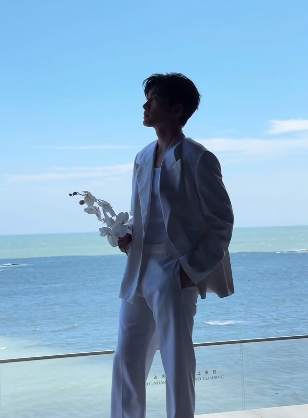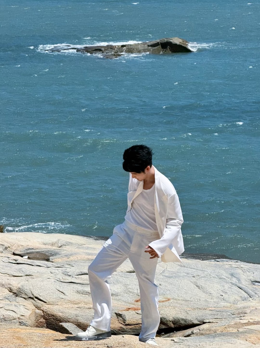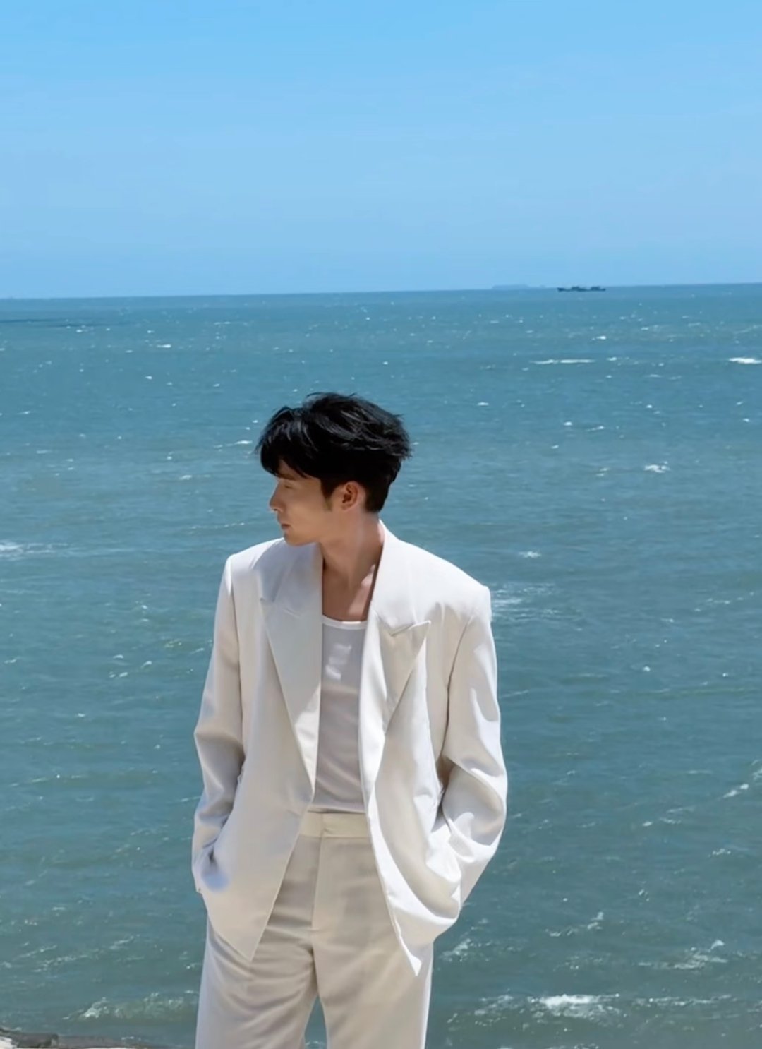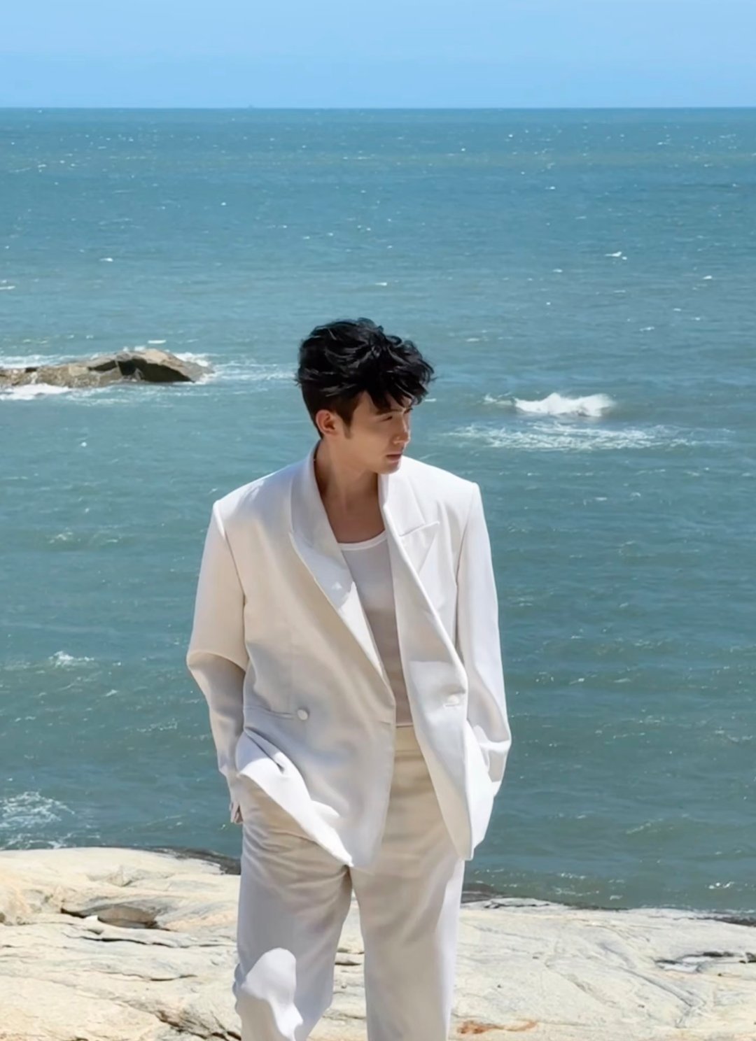 在海边穿白西装套装的张彬彬太帅了吧~