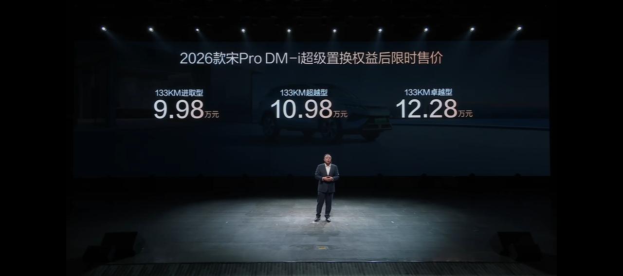 998的宋Pro来了。2026款比亚迪宋家族上市,我们分开来给大家讲透 2026款宋L DM-i 价格:13.98万~15.68万 新增官窑灰,星河米 前座按摩 变成怀挡 冷暖箱(零下6到零上50度) 油耗从3.9升降到3.4升(NEDC) 纯电续航增加到200公里,满油满电1630公里 全系标配云辇-C,TBC高速爆胎稳定,三目的天神之眼C 联动好孩子儿童座椅(开车门,儿童座椅自动旋转),宠物安全座椅,倍轻松眼罩,360相机,游戏手柄 2026款宋pro DM-i 价格:9.98万~12.28万 新增冰珀青,变怀挡,亏电油耗降到3.2,纯电续航增加到133公里,满油满电1508公里,升级成前麦弗逊后多连杆悬架【来自懂车帝车友圈】