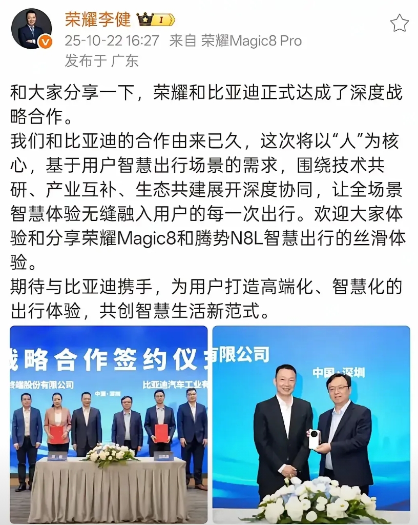 荣耀和比亚迪牵手成功!这是要搞啥子嘛?耀子造车?还是比亚迪进军手机领域?