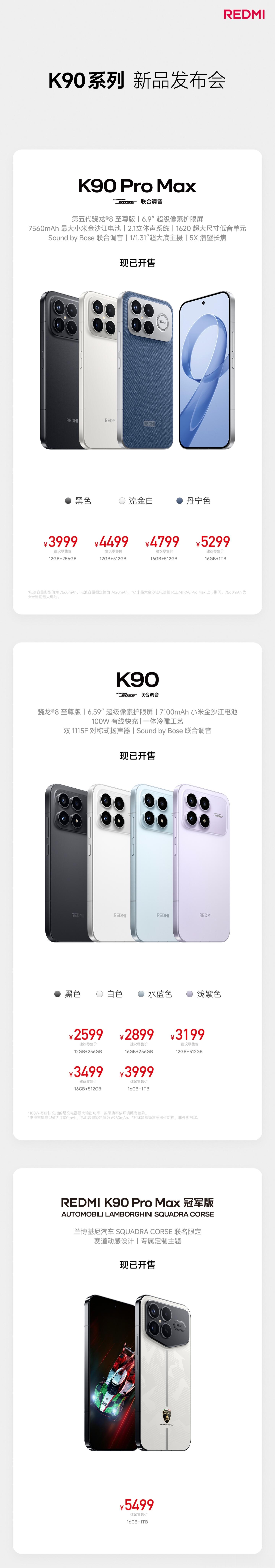 Redmi 这次是把旗舰配置直接下放啊!K90标准版2599元起就给到骁龙8至尊版,6.59英寸黄金尺寸屏还是小米17 Pro Max同款超级像素,7100mAh大电池+100W快充彻底告别电量焦虑,首次加入2.5X长焦,IP68也安排上了。