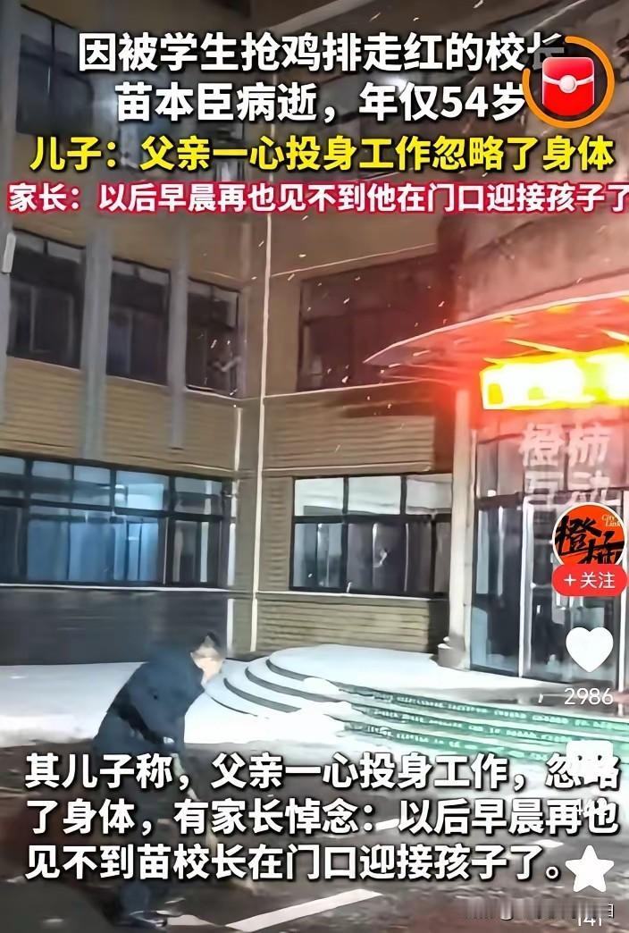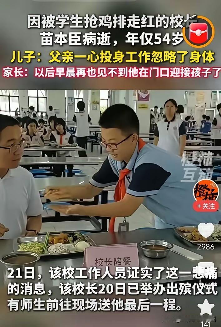 太可惜了!太可惜了! 因“被学生抢鸡排”走红的济南市里仁学校校长苗本臣,10月19日凌晨突然病逝,终年54岁。 苗校长儿子说:父亲一心扑在工作上忽略了身体,月初刚做了心血管手术,术后出院一周就出事了! 苗校长20日举办出殡仪式,有家长和孩子自发来送最后一程! 有家长悼念:以后早晨再也看不到苗校长在校门口接孩子们了! 抢鸡排的学生说:他以后都把鸡排让给校长! 真是太痛心了,我还记得那个视频很温馨,心想能和学生打成一片的校长肯定非常优秀,是个好校长,可惜英年早逝,校长陪餐的那张桌子前再也看不到他的身影了,苗校长一路走好[祈祷][祈祷][祈祷]